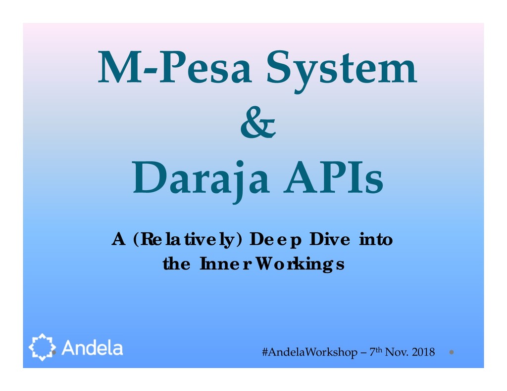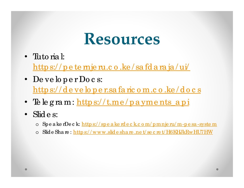 https://t.me/payments_api • Slides: o SpeakerDeck: https://speakerdeck.com/pmnjeru/m-pesa-system o SlideShare: https://www.slideshare.net/secret/H6KHJkRwHU7HW