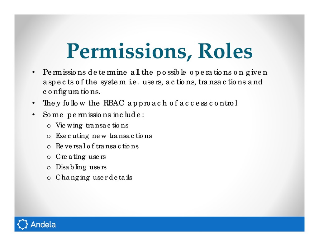 given aspects of the system i.e. users, actions, transactions and configurations. • They follow the RBAC approach of access control • Some permissions include: o Viewing transactions o Executing new transactions o Reversal of transactions o Creating users o Disabling users o Changing user details