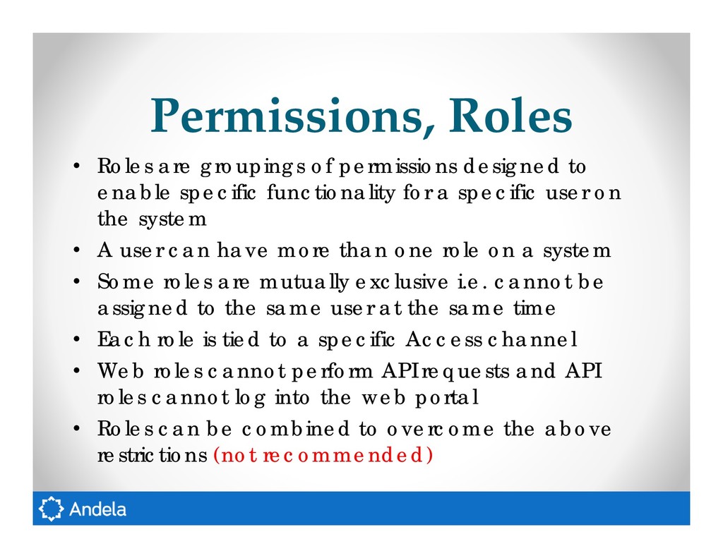 enable specific functionality for a specific user on the system • A user can have more than one role on a system • Some roles are mutually exclusive i.e. cannot be assigned to the same user at the same time • Each role is tied to a specific Access channel • Web roles cannot perform API requests and API roles cannot log into the web portal • Roles can be combined to overcome the above restrictions (not recommended)