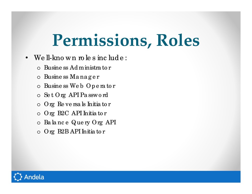 Business Manager o Business Web Operator o Set Org API Password o Org Reversals Initiator o Org B2C API Initiator o Balance Query Org API o Org B2B API Initiator