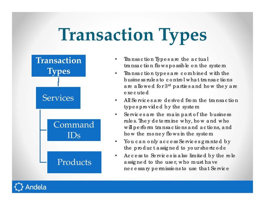 Types are the actual transaction flows possible on the system • Transaction types are combined with the business rules to control what transactions are allowed for 3rd parties and how they are executed • All Services are derived from the transaction types provided by the system • Services are the main part of the business rules. They determine why, how and who will perform transactions and actions, and how the money flows in the system • You can only access Services granted by the product assigned to your shortcode • Access to Services is also limited by the role assigned to the user, who must have necessary permissions to use that Service
