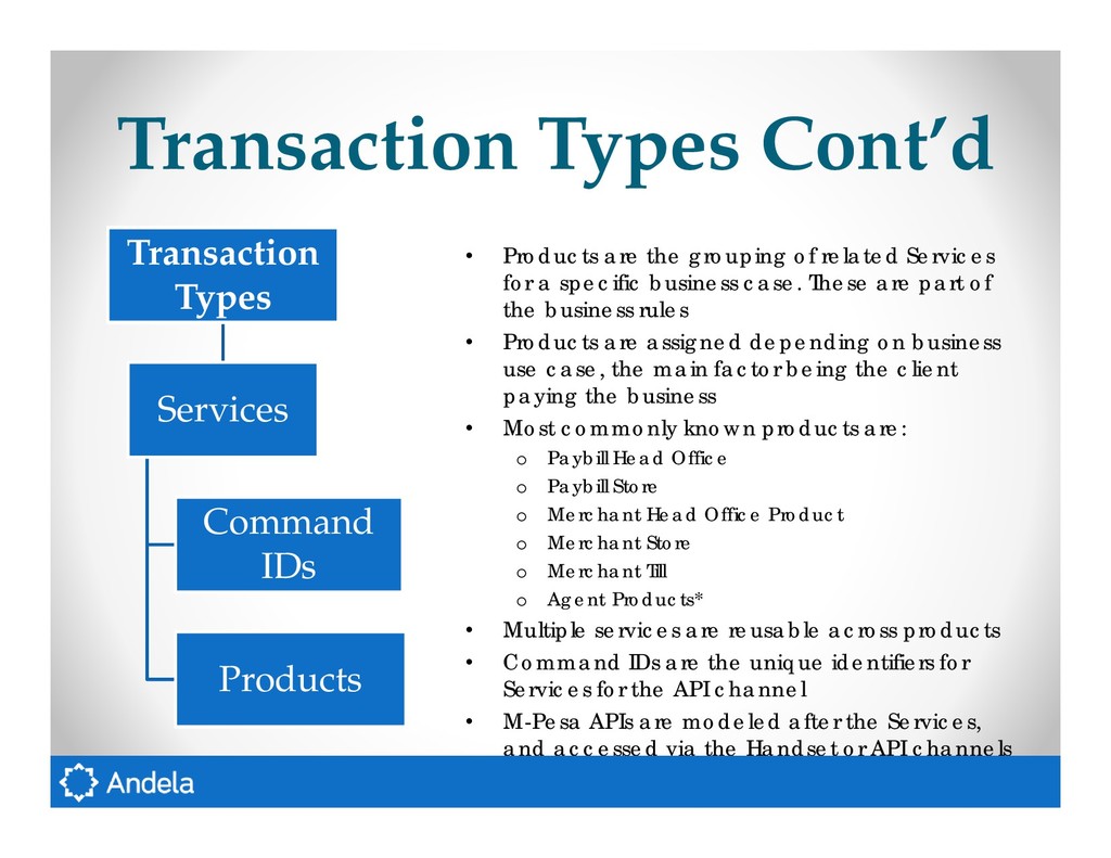 Products are the grouping of related Services for a specific business case. These are part of the business rules • Products are assigned depending on business use case, the main factor being the client paying the business • Most commonly known products are: o Paybill Head Office o Paybill Store o Merchant Head Office Product o Merchant Store o Merchant Till o Agent Products* • Multiple services are reusable across products • Command IDs are the unique identifiers for Services for the API channel • M-Pesa APIs are modeled after the Services, and accessed via the Handset or API channels