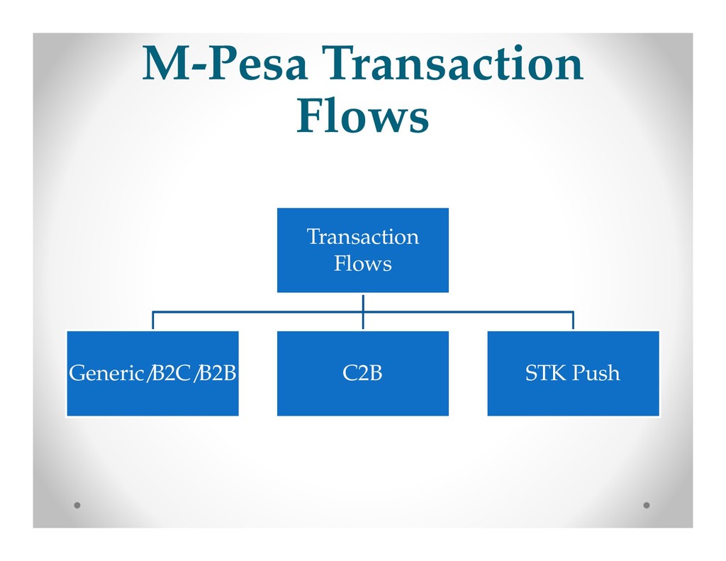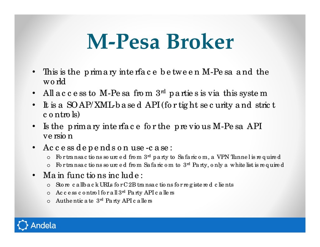 and the world • All access to M-Pesa from 3rd parties is via this system • It is a SOAP/XML-based API (for tight security and strict controls) • Is the primary interface for the previous M-Pesa API version • Access depends on use-case: o For transactions sourced from 3rd party to Safaricom, a VPN Tunnel is required o For transactions sourced from Safaricom to 3rd Party, only a whitelist is required • Main functions include: o Store callback URLs for C2B transactions for registered clients o Access control for all 3rd Party API callers o Authenticate 3rd Party API callers