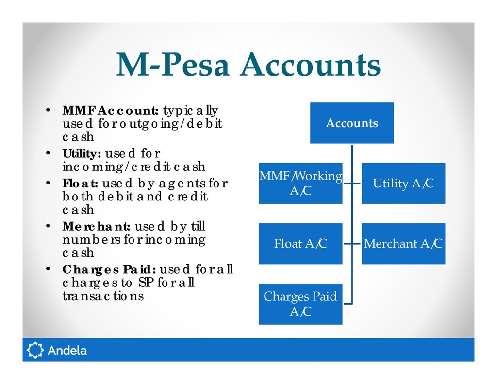 A/C Charges Paid A/C • MMF Account: typically used for outgoing/debit cash • Utility: used for incoming/credit cash • Float: used by agents for both debit and credit cash • Merchant: used by till numbers for incoming cash • Charges Paid: used for all charges to SP for all transactions