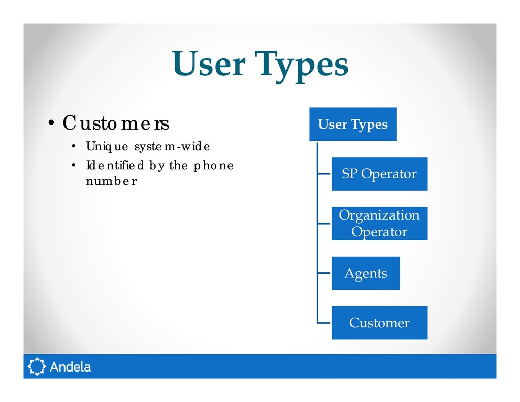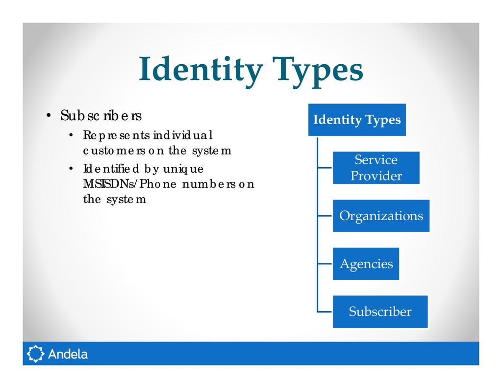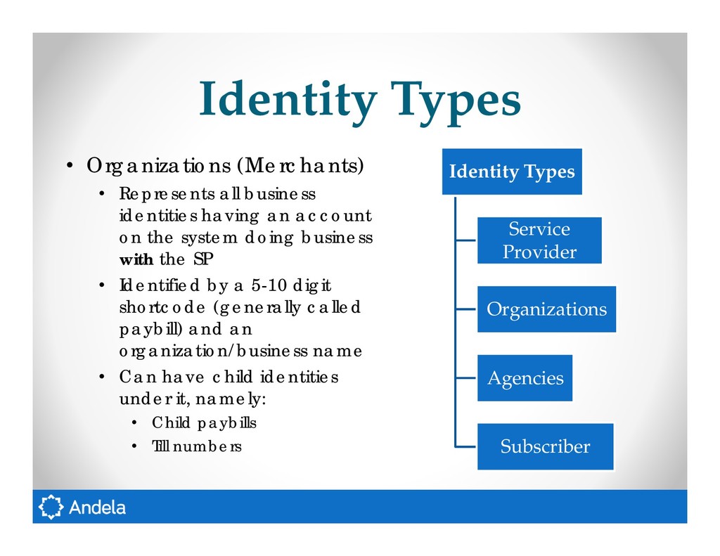 Organizations (Merchants) • Represents all business identities having an account on the system doing business with the SP • Identified by a 5-10 digit shortcode (generally called paybill) and an organization/business name • Can have child identities under it, namely: • Child paybills • Till numbers
