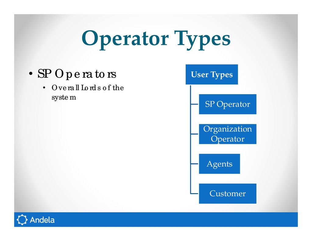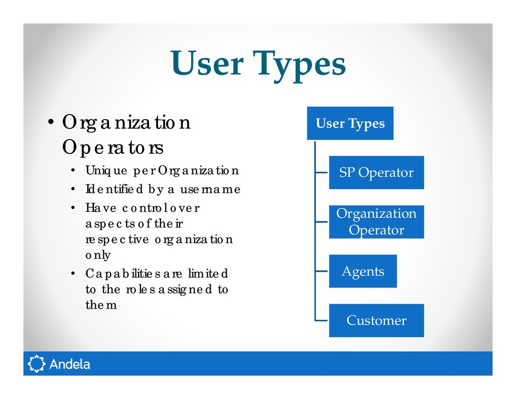 • Organization Operators • Unique per Organization • Identified by a username • Have control over aspects of their respective organization only • Capabilities are limited to the roles assigned to them