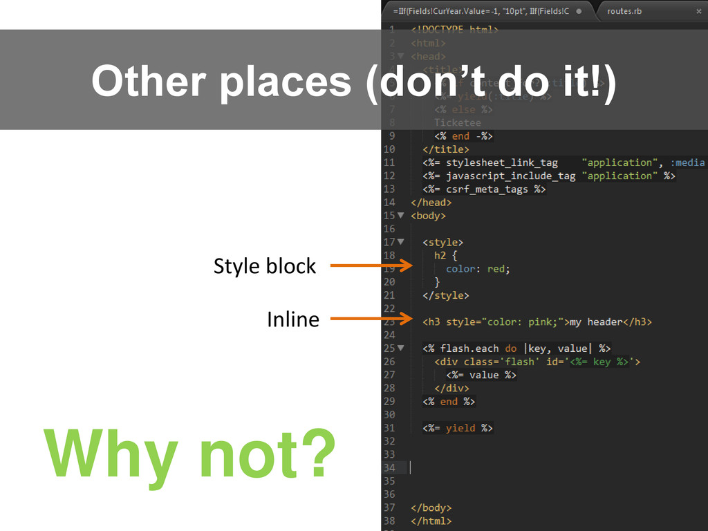 Other places (don’t do it!) Style block Inline Why not?