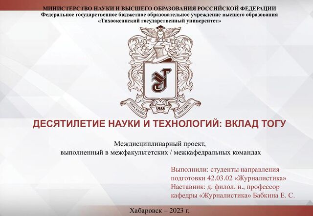 «Десятилетие науки и технологий: вклад ТОГУ» разработан в контексте Государственной политики Российской Федерации в сфере научных исследований и инновационных разработок и направлен на решение ряда актуальных социально- экономических проблем и проблем высшей школы, среди которых наиболее отчетливо выделяются: 1) Проблема преемственности. Каждый новый результат в науке возникает на основе предшествующих знаний, критически пересмотренных и приспособленных к новым, актуальным, ситуациям. 2) Проблема воспроизводства научных кадров, развития научного потенциала высокопотенциальной молодежи. В Концепции национальной безопасности Российской Федерации в качестве внутренних угроз, сдерживающих инновационное развитие страны, отмечаются недостаточный уровень подготовки научных кадров, а также снижение научно- технологического и образовательного уровня граждан. К внешним источникам угроз отнесено ограничение доступа российских исследователей к новейшим технологиям, результатам исследований и разработок мирового уровня, а также политика зарубежных стран и компаний по стимулированию эмиграции высококвалифицированных ученых и специалистов.