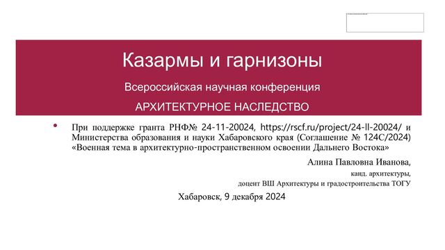 поддержке гранта РНФ№ 24-11-20024, https://rscf.ru/project/24-ll-20024/ и Министерства образования и науки Хабаровского края (Соглашение № 124С/2024) «Военная тема в архитектурно-пространственном освоении Дальнего Востока» Алина Павловна Иванова, канд. архитектуры, доцент ВШ Архитектуры и градостроительства ТОГУ Хабаровск, 9 декабря 2024