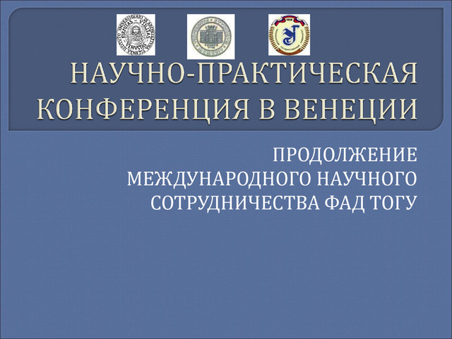 «Дизайн архитектурной среды» по маршруту «Рим-Верона-Тревизо- Венеция» • Организована стажировка студентов и преподавателей ТОГУ в лаборатории античных материалов LAMA Государственного Университета Архитектуры Венеции IUAV (Италия) и получены сертификаты • Подписан договор о совместной деятельности ТОГУ с организацией WUP (Тревизо, Италия) – посредником по осуществлению контактов ТОГУ с вузами и культурными организациями Италии и Франции 2. Подготовлена и проведена международная научно-практическая конференция преподавателей и архитекторов-практиков в г. Венеция и г. Гориция (совместно с WUP) • Организована выставка студентов и магистрантов ТОГУ в рамках конференции. • Подготовлен к публикации сборник Материалов международной научно-практической конференции в г. Венеция (совместно с WUP) • Достигнуто соглашение о проведении производственной практики студентов ФАД ТОГУ в архитектурной студии «ARKA associate» (Венеция, Италия) летом 2014 г. • Подготовлен Меморандум о сотрудничестве ТОГУ с Университетом г. Триест (Италия) • Подготовлен договор о сотрудничестве ТОГУ с Системой лабораторий Государственного Университета Архитектуры Венеции (Италия)