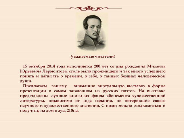 2-е изд.; испр. - М.: Худож.лит., 1967. - 607с.: ил. Это второе издание книги, сразу по выходе ставшей широко известной и получившей Государственную премию. Писатель и литературовед, доктор филологии и народный артист СССР, выступавший со сцены и телеэкрана со своими незабываемыми «устными рассказами», И. Л. Андроников многие годы посвятил исследованию величайшего наследия М.Ю. Лермонтова. Каждое его произведение связано с новыми сенсационными открытиями, сделанными автором при работе в архивах, с уникальными материалами и находками, присланными ученому горячими почитателями творчества великого русского поэта. Автор не забывает упомянуть об этом в предисловии: «В этой книге рассказано, в частности, о том вкладе в наше лермонтоведение, которое в самое последнее время сделали читатели, телезрители, радиослушатели. Вы прочтете здесь о старом альбоме, подаренном медсестрой из города Серпухова, о неизвестном лермонтовском рисунке, который был открыт в Москве после телевизионной передачи о Лермонтове, о неизвестных автографах поэта, сообщенных сотрудницей Ленинградского института физиологии. Но кроме того, и о мемуарах, найденных с помощью французского хирурга, о лермонтовских реликвиях, хранившихся у мюнхенского искусствоведа, о неизвестных лермонтовских стихах, уцелевших в средневековом замке в Баварии, об изображении, обнаруженном в Швеции». В сборник вошли работы «Утраченные записки», «Сокровища замка Хохберг», «Чудеса телевидения», «Пакет из Стокгольма», «Дар медсестры Немковой», «Неизвестная нам Мария», «Строки из писем 1841 года», «Бородино», «Лермонтов и его парт...» и др. Доверительная интонация рассказчика делает книгу доступной самому неискушенному читателю. А иллюстрации, расположенные в конце издания, зримо приближают к нам времена почти 200-летней давности.