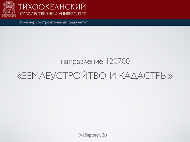 Презентация для абитуриентов направления 120700 «Землеустройтсво и кадастры» кафедры геодезии и землеустройства Тихоокеанского государственного университета.