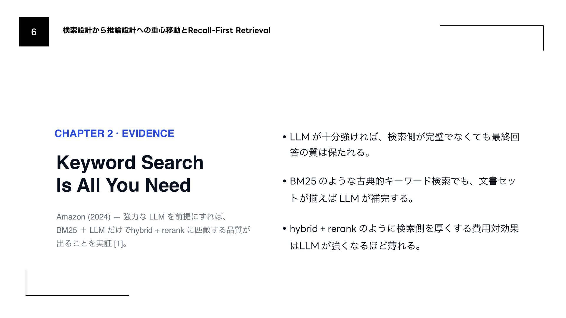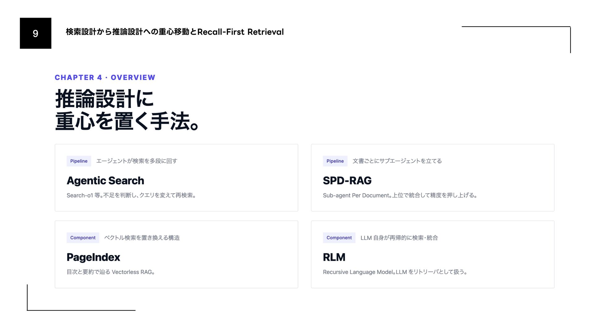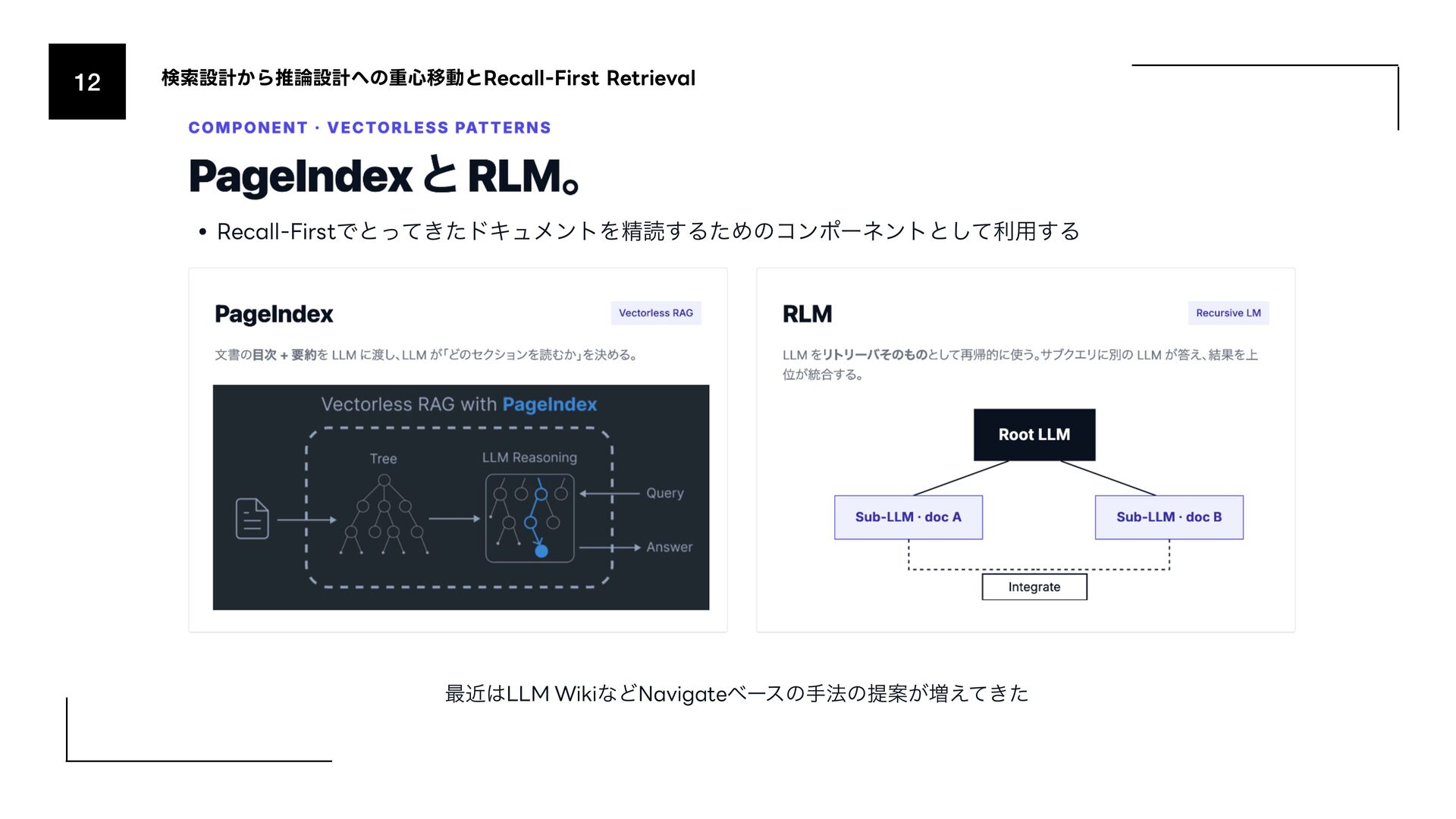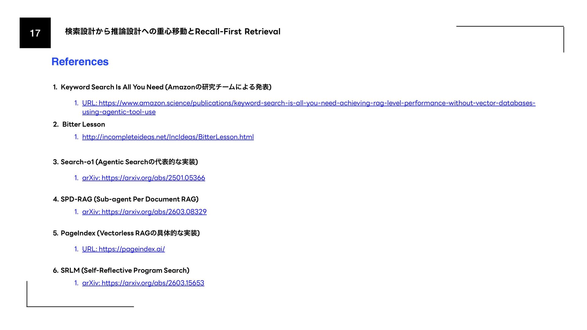 (AmazonͷݚڀνʔϜʹΑΔൃද) 1. URL: https://www.amazon.science/publications/keyword-search-is-all-you-need-achieving-rag-level-performance-without-vector-databases- using-agentic-tool-use 2. Bitter Lesson 1. http://incompleteideas.net/IncIdeas/BitterLesson.html 3. Search-o1 (Agentic Searchͷදతͳ࣮) 1. arXiv: https://arxiv.org/abs/2501.05366 4. SPD-RAG (Sub-agent Per Document RAG) 1. arXiv: https://arxiv.org/abs/2603.08329 5. PageIndex (Vectorless RAGͷ۩ମతͳ࣮) 1. URL: https://pageindex.ai/ 6. SRLM (Self-Re fl ective Program Search) 1. arXiv: https://arxiv.org/abs/2603.15653