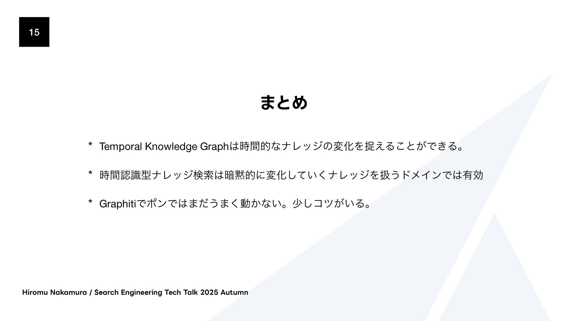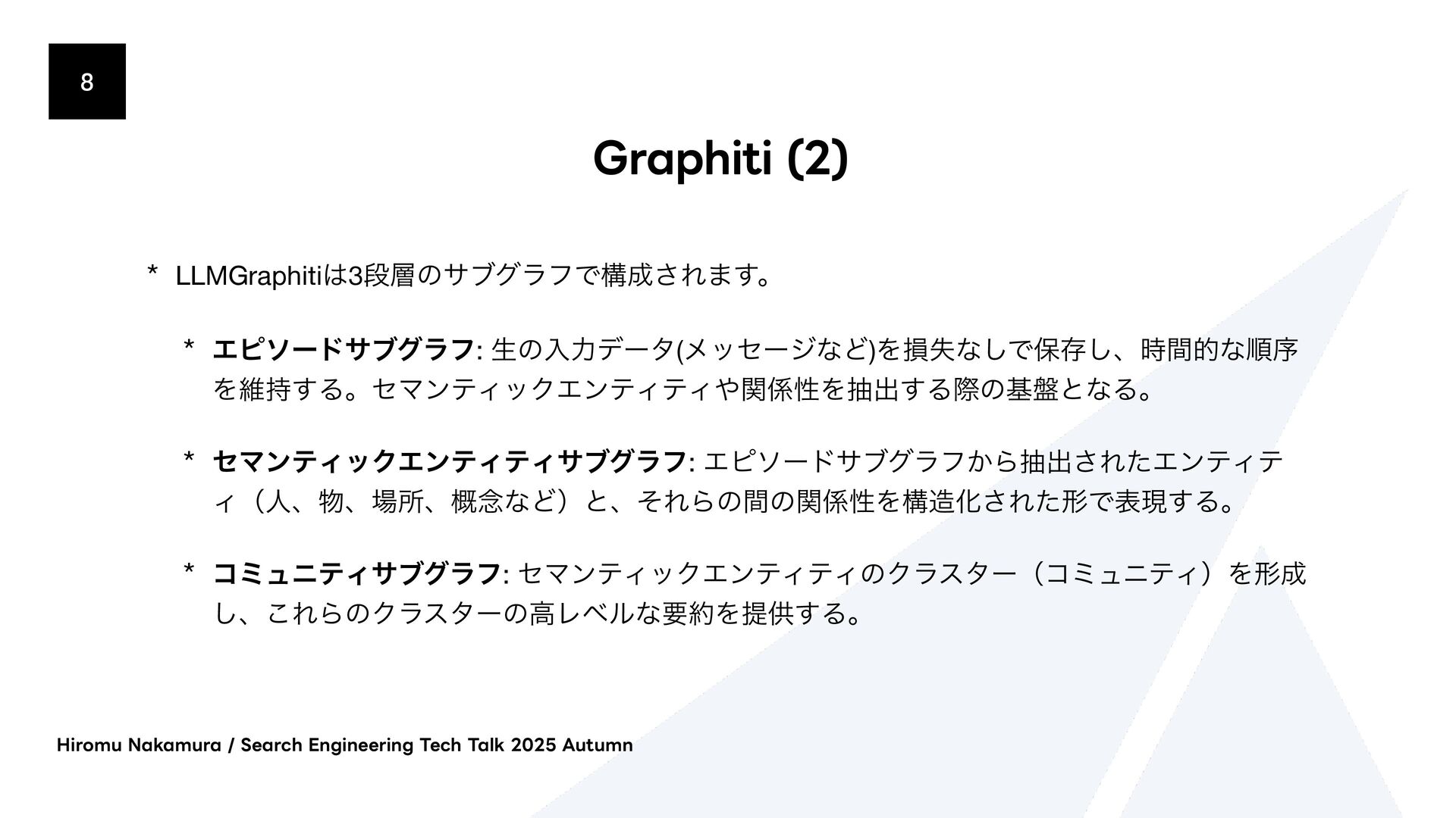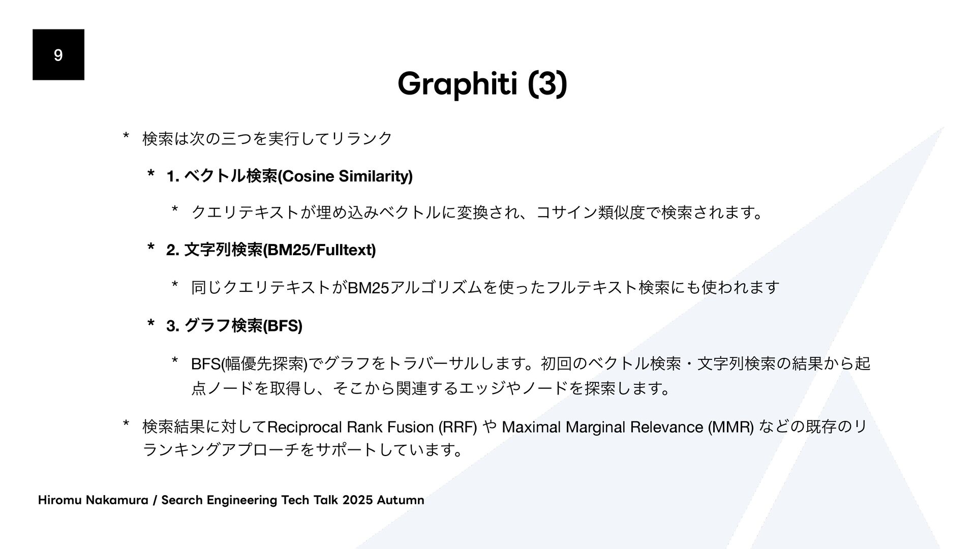 ΫΤϦςΩετ͕ຒΊࠐΈϕΫτϧʹม͞ΕɺίαΠϯྨࣅͰݕࡧ͞Ε·͢ɻ * 2. จࣈྻݕࡧ(BM25/Fulltext) * ಉ͡ΫΤϦςΩετ͕BM25ΞϧΰϦζϜΛͬͨϑϧςΩετݕࡧʹΘΕ·͢ * 3. άϥϑݕࡧ(BFS) * BFS(෯༏ઌ୳ࡧ)ͰάϥϑΛτϥόʔαϧ͠·͢ɻॳճͷϕΫτϧݕࡧɾจࣈྻݕࡧͷ݁Ռ͔Βى ϊʔυΛऔಘ͠ɺ͔ͦ͜Βؔ࿈͢ΔΤοδϊʔυΛ୳ࡧ͠·͢ɻ * ݕࡧ݁Ռʹରͯ͠Reciprocal Rank Fusion (RRF) Maximal Marginal Relevance (MMR) ͳͲͷطଘͷϦ ϥϯΩϯάΞϓϩʔνΛαϙʔτ͍ͯ͠·͢ɻ )JSPNV/BLBNVSB4FBSDI&OHJOFFSJOH5FDI5BML"VUVNO
