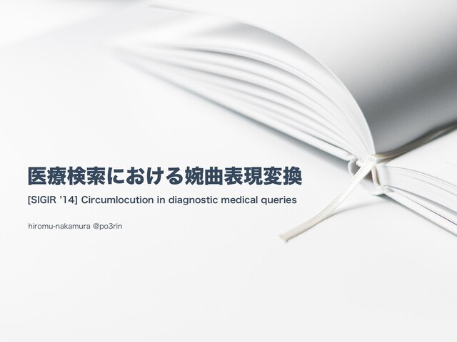 ҩྍݕࡧʹڵຯ࣋ͬͨਓ ๏ҩྍݕࡧʹ͓͚Δ2VFSZ6OEFSTUBOEJOHͷಈΛ·ͱΊͨͷɻগ͠ݹ͍ɻ IUUQJSDTHFPSHFUPXOFEVEPXOMPBETRVFSZ@DMBSJpDBUJPOQEG ๏*&&&ͰҩྍใݕࡧϑϨʔϜϫʔΫͱͯ͠ɺҙຯతʹFOIBODFE͞ΕͨసஔΠϯσοΫεߏஙɺώϡʔ ϦεςΟοΫͳॏΈ͚ख๏͕ఏҊ͞ΕͯΔɻ͜͜·Ͱͷ3FMBUFE8PSL͕͔ͳΓ·ͱ·ͬͯΔɻ IUUQTJFFFYQMPSFJFFFPSHEPDVNFOU