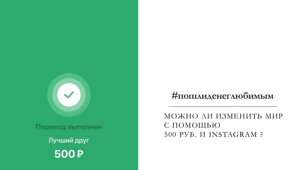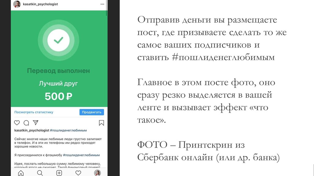 самое ваших подписчиков и ставить #пошлиденеглюбимым Главное в этом посте фото, оно сразу резко выделяется в вашей ленте и вызывает эффект «что такое». ФОТО – Принтскрин из Сбербанк онлайн (или др. банка)