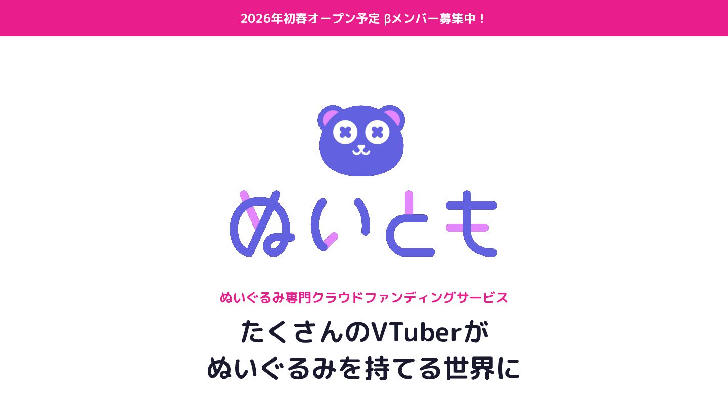 2026年初春オープン予定 βメンバー募集中! ぬいぐるみ専門クラウドファンディングサービス たくさんのVTuberが ぬいぐるみを持てる世界に
