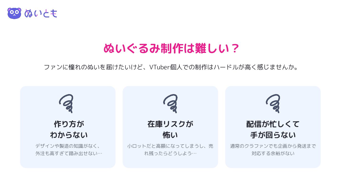 ぬいぐるみ制作は難しい? ファンに憧れのぬいを届けたいけど、VTuber個人での制作はハードルが高く感じませんか。 作り方が わからない デザインや製造の知識がなく、 外注も高すぎて踏み出せない… 在庫リスクが 怖い 小ロットだと高額になってしまうし、売 れ残ったらどうしよう…