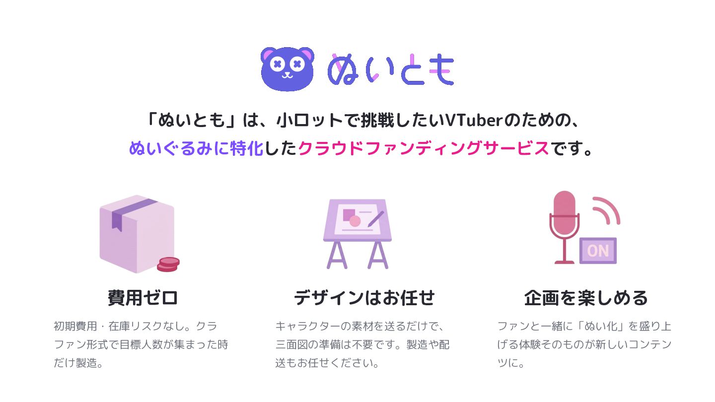 げる体験そのものが新しいコンテン ツに。 「ぬいとも」は、小ロットで挑戦したいVTuberのための、 ぬいぐるみに特化したクラウドファンディングサービスです。