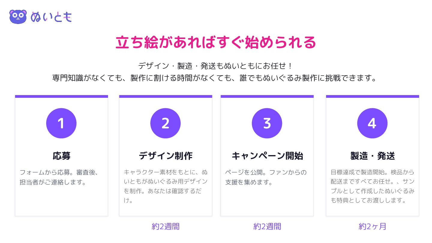 4 製造・発送 目標達成で製造開始。検品から 配送まですべてお任せ。、サン プルとして作成したぬいぐるみ も特典としてお渡しします。 3 キャンペーン開始 ページを公開。ファンからの 支援を集めます。 立ち絵があればすぐ始められる デザイン・製造・発送もぬいともにお任せ! 専門知識がなくても、製作に割ける時間がなくても、誰でもぬいぐるみ製作に挑戦できます。 約2ヶ月 約2週間 約2週間