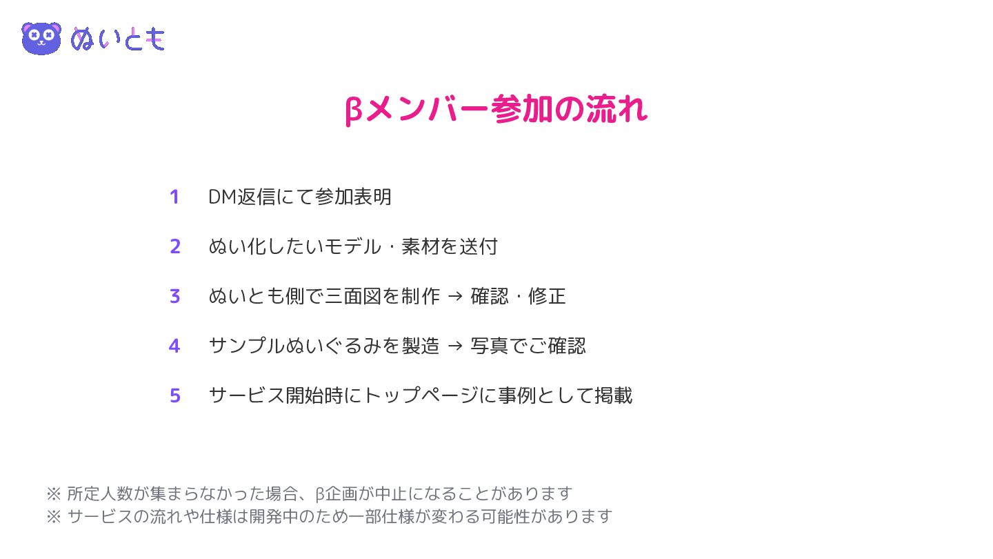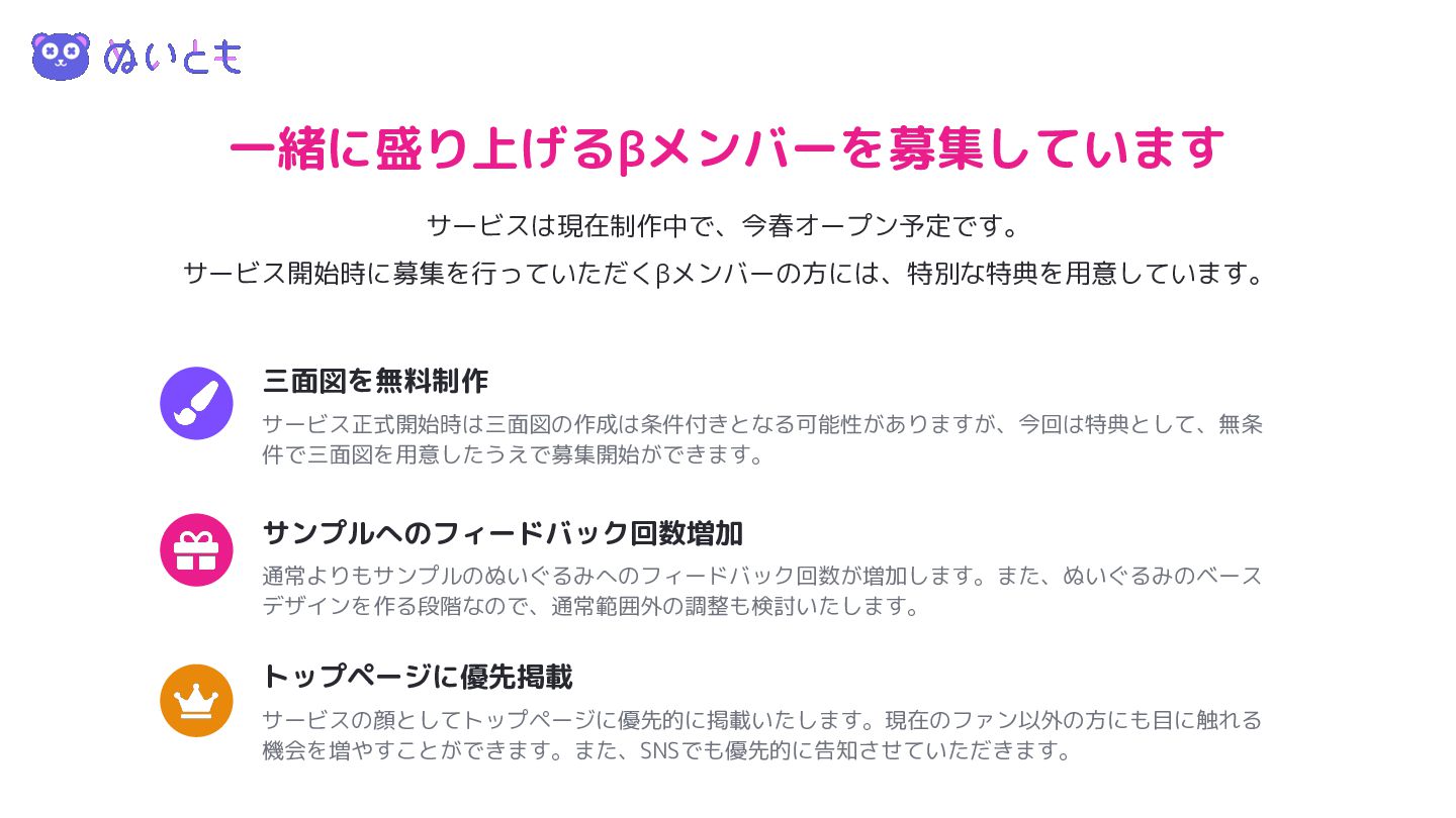 一緒に盛り上げるβメンバーを募集しています 三面図を無料制作 サービス正式開始時は三面図の作成は条件付きとなる可能性がありますが、今回は特典として、無条 件で三面図を用意したうえで募集開始ができます。 サンプルへのフィードバック回数増加 通常よりもサンプルのぬいぐるみへのフィードバック回数が増加します。また、ぬいぐるみのベース デザインを作る段階なので、通常範囲外の調整も検討いたします。 トップページに優先掲載 サービスの顔としてトップページに優先的に掲載いたします。現在のファン以外の方にも目に触れる 機会を増やすことができます。また、SNSでも優先的に告知させていただきます。