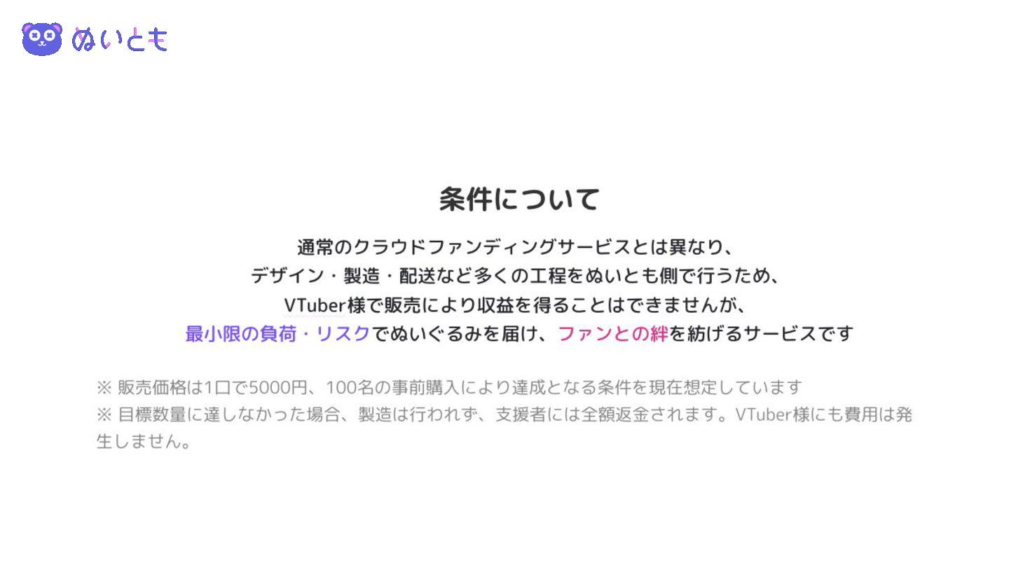 条件について 通常のクラウドファンディングサービスとは異なり、 デザイン・製造・配送など多くの工程をぬいとも側で行うため、 VTuber様で販売により収益を得ることはできませんが、 最小限の負荷・リスクでぬいぐるみを届け、ファンとの絆を紡げるサービスです ※ 販売価格は1口で5000円、100名の事前購入により達成となる条件を現在想定しています ※ 目標数量に達しなかった場合、製造は行われず、支援者には全額返金されます。VTuber様にも費用は発 生しません。