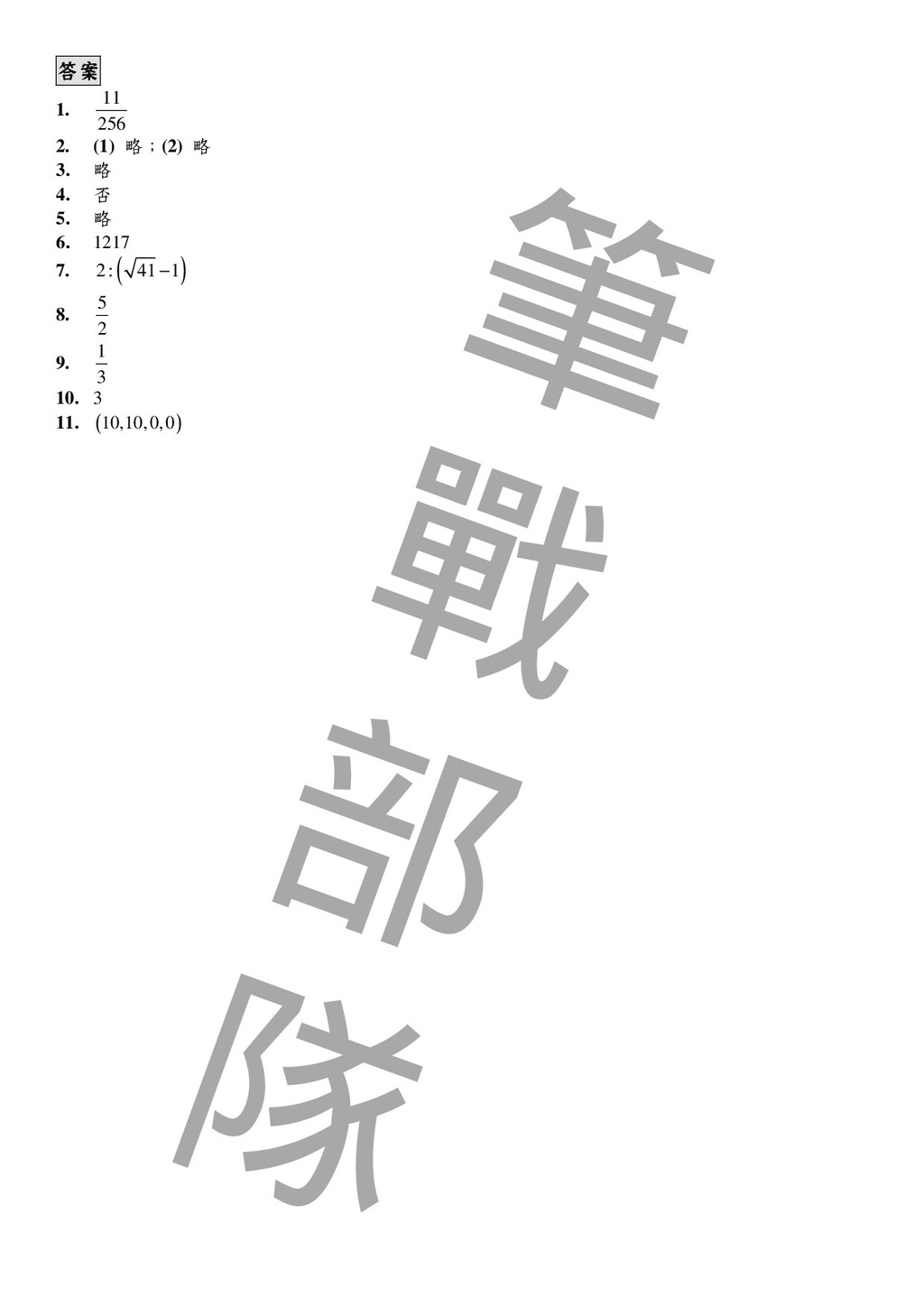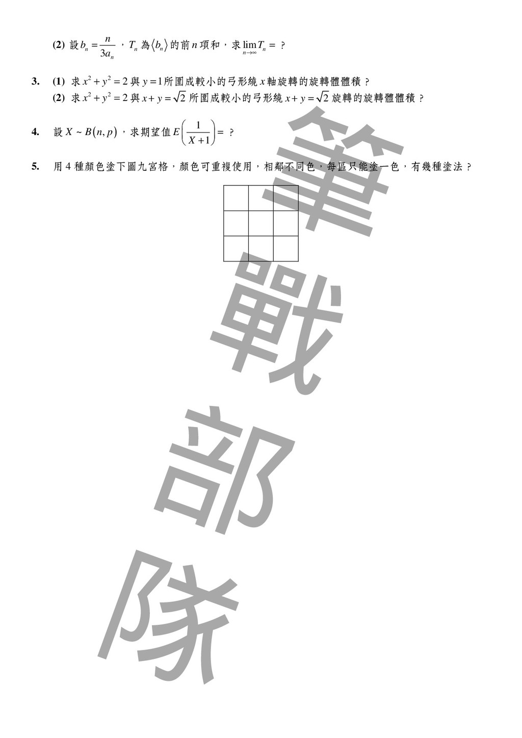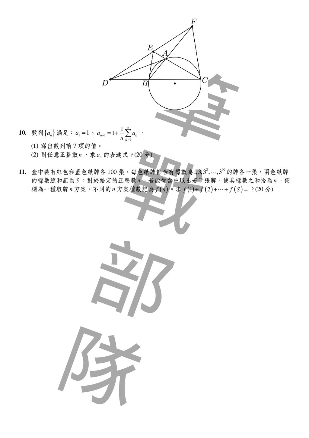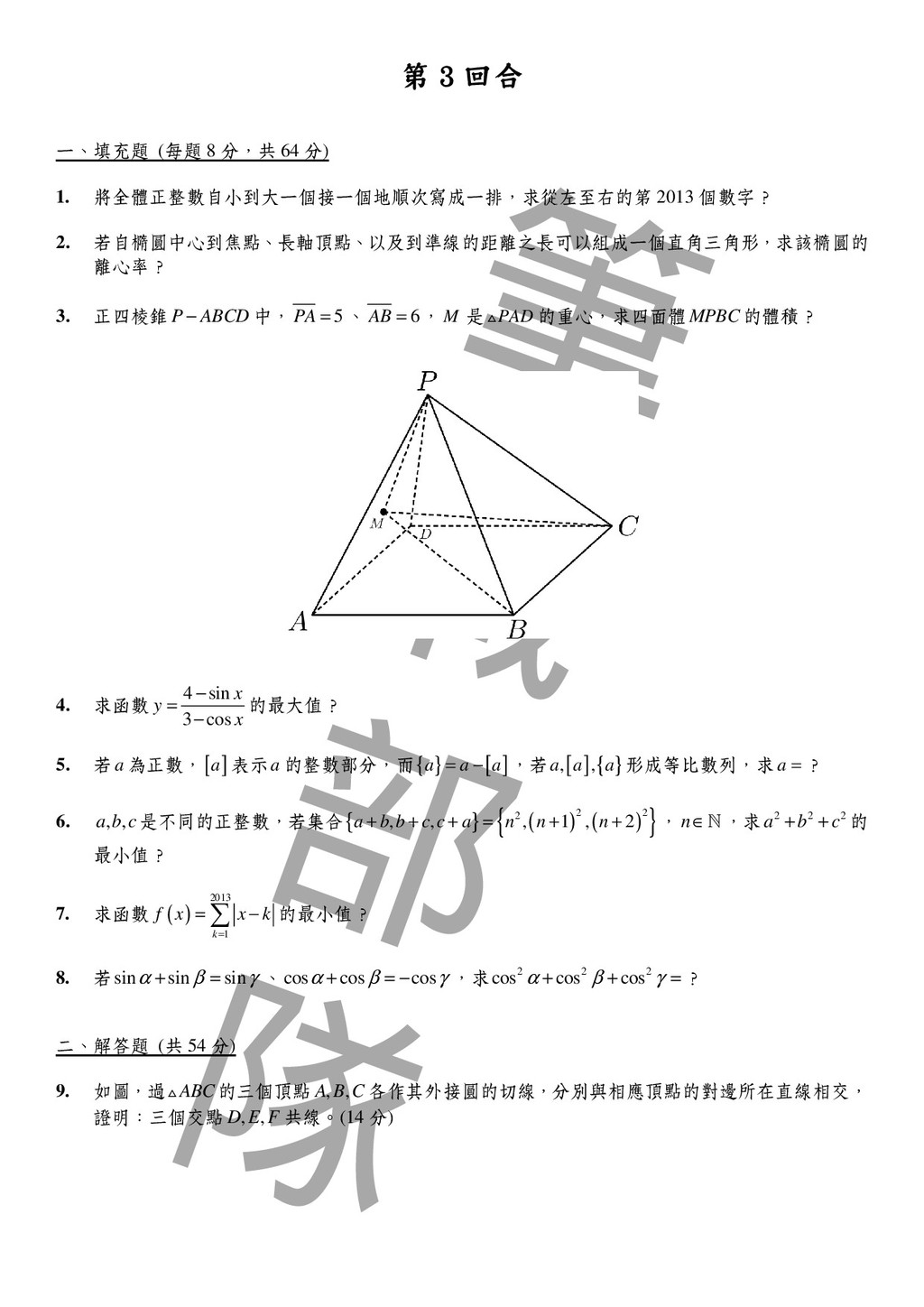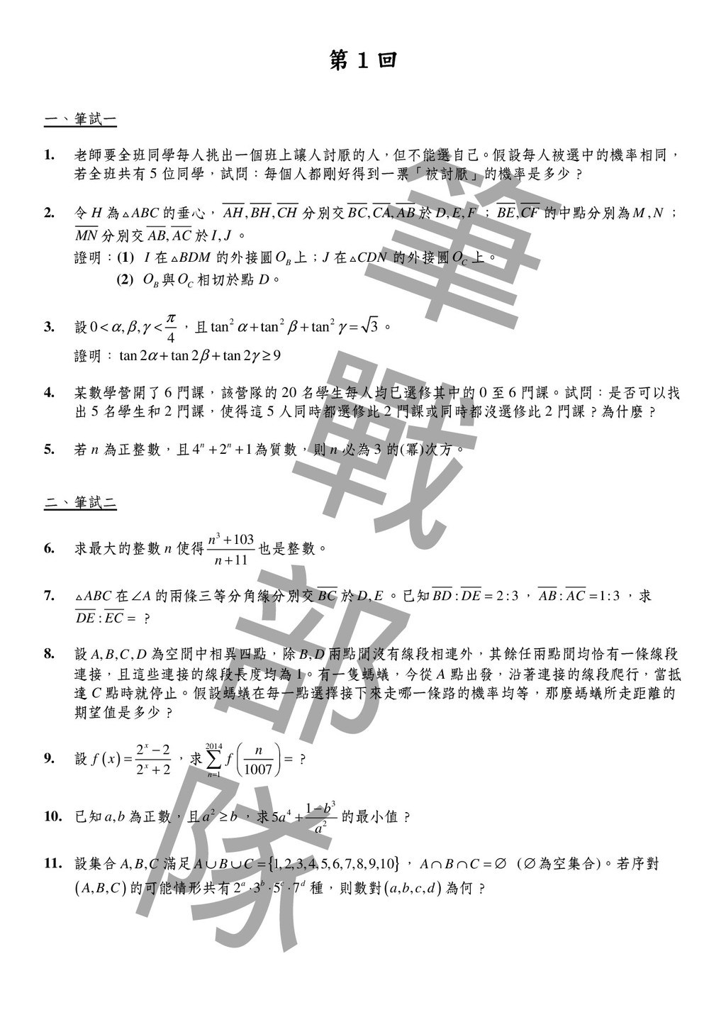 令 H 為 ABC △ 的垂心, , , AH BH CH 分別交 , , BC CA AB 於 , , D E F ; , BE CF 的中點分別為 , M N ; MN 分別交 , AB AC 於 , I J 。 證明:(1) I 在 BDM △ 的外接圓 B O 上;J 在 CDN △ 的外接圓 C O 上。 (2) B O 與 C O 相切於點 D。 3. 設0 , , 4 π α β γ < < ,且 2 2 2 tan tan tan 3 α β γ + + = 。 證明: tan 2 tan 2 tan 2 9 α β γ + + ≥ 4. 某數學營開了 6 門課,該營隊的 20 名學生每人均已選修其中的 0 至 6 門課。試問:是否可以找 出 5 名學生和 2 門課,使得這 5 人同時都選修此 2 門課或同時都沒選修此 2 門課?為什麼? 5. 若 n 為正整數,且4 2 1 n n + + 為質數,則 n 必為 3 的(冪)次方。 二、筆試二 6. 求最大的整數 n 使得 3 103 11 n n + + 也是整數。 7. ABC △ 在 A ∠ 的兩條三等分角線分別交 BC 於 , D E 。已知 : 2 :3 BD DE = , : 1:3 AB AC = ,求 : DE EC = ? 8. 設 , , , A B C D 為空間中相異四點,除 , B D 兩點間沒有線段相連外,其餘任兩點間均恰有一條線段 連接,且這些連接的線段長度均為 1。有一隻螞蟻,今從 A 點出發,沿著連接的線段爬行,當抵 達 C 點時就停止。假設螞蟻在每一點選擇接下來走哪一條路的機率均等,那麼螞蟻所走距離的 期望值是多少? 9. 設 ( ) 2 2 2 2 x x f x − = + ,求 2014 1 1007 n n f = = ∑ ? 10. 已知 , a b 為正數,且 2 a b ≥ ,求 3 4 2 1 5 b a a − + 的最小值? 11. 設集合 , , A B C 滿足 { } 1,2,3,4,5,6,7,8,9,10 A B C ∪ ∪ = , A B C ∩ ∩ = ∅ (∅ 為空集合)。若序對 ( ) , , A B C 的可能情形共有2 3 5 7 a b c d ⋅ ⋅ ⋅ 種,則數對( ) , , , a b c d 為何?