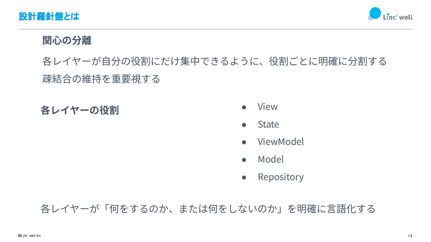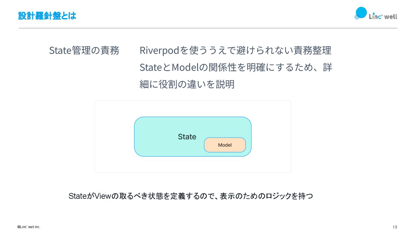 13 ©Linc' well inc. 設計羅針盤とは State管理の責務 Riverpodを使ううえで避けられない責務整理 StateとModelの関係性を明確にするため、詳 細に役割の違いを説明 StateがViewの取るべき状態を定義するので、表示のためのロジックを持つ