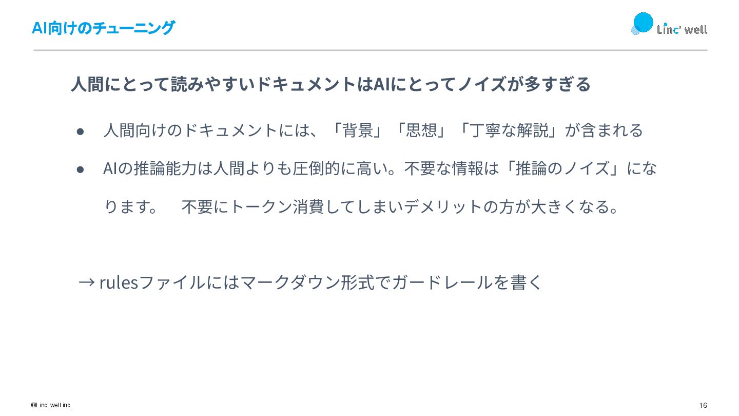 16 ©Linc' well inc. AI向けのチューニング ⼈間にとって読みやすいドキュメントはAIにとってノイズが多すぎる • ⼈間向けのドキュメントには、「背景」「思想」「丁寧な解説」が含まれる • AIの推論能⼒は⼈間よりも圧倒的に⾼い。不要な情報は「推論のノイズ」にな