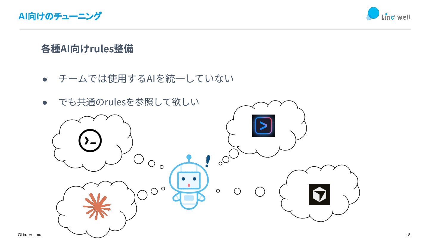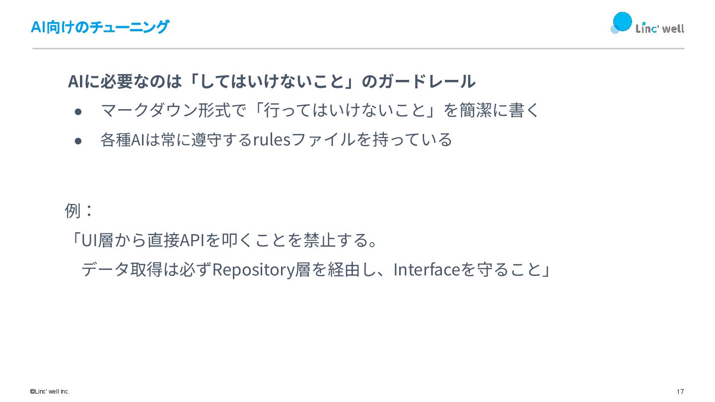 17 ©Linc' well inc. AI向けのチューニング AIに必要なのは「してはいけないこと」のガードレール • マークダウン形式で「⾏ってはいけないこと」を簡潔に書く • 各種AIは常に遵守するrulesファイルを持っている