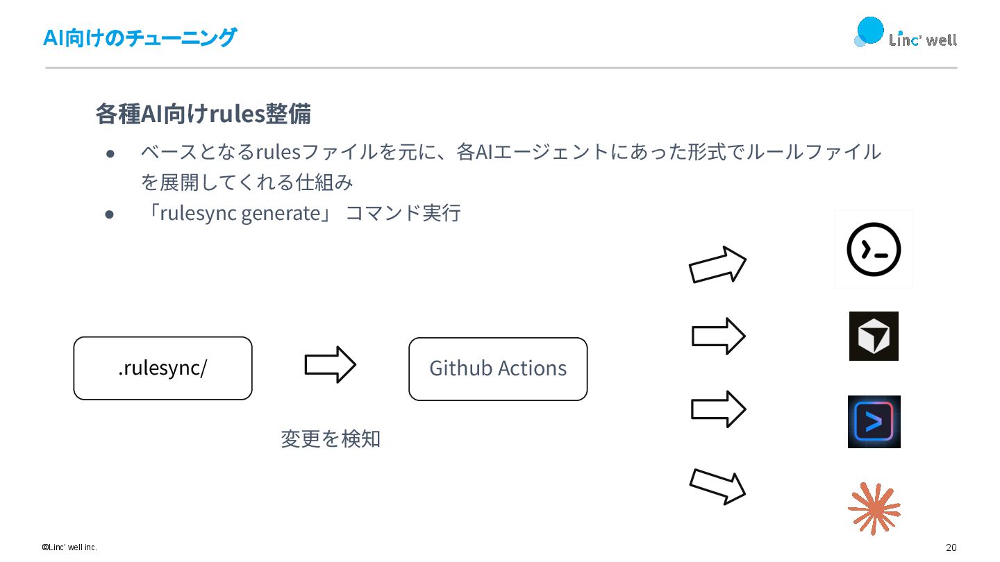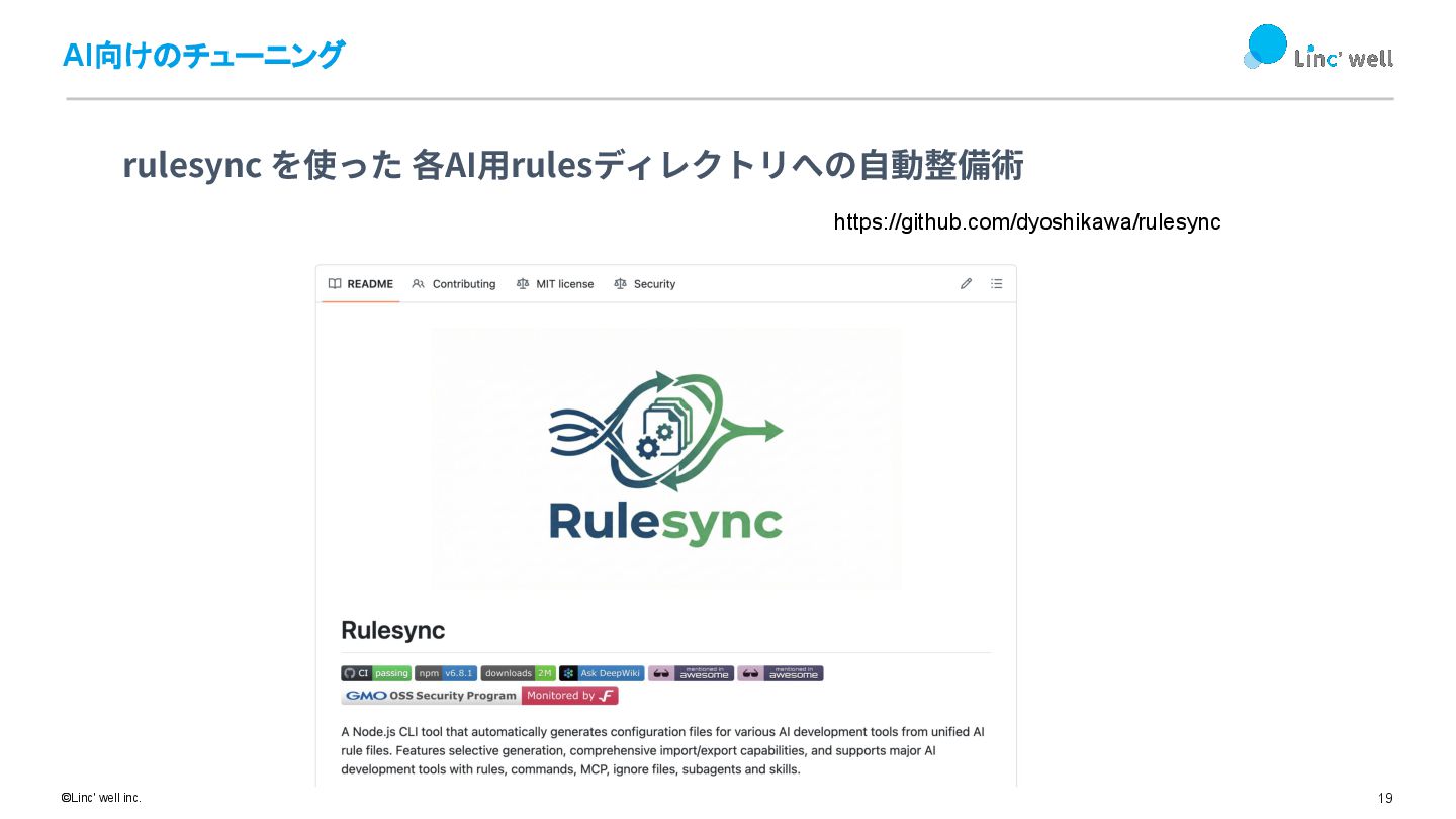 19 ©Linc' well inc. AI向けのチューニング rulesync を使った 各AI⽤rulesディレクトリへの⾃動整備術 https://github.com/dyoshikawa/rulesync