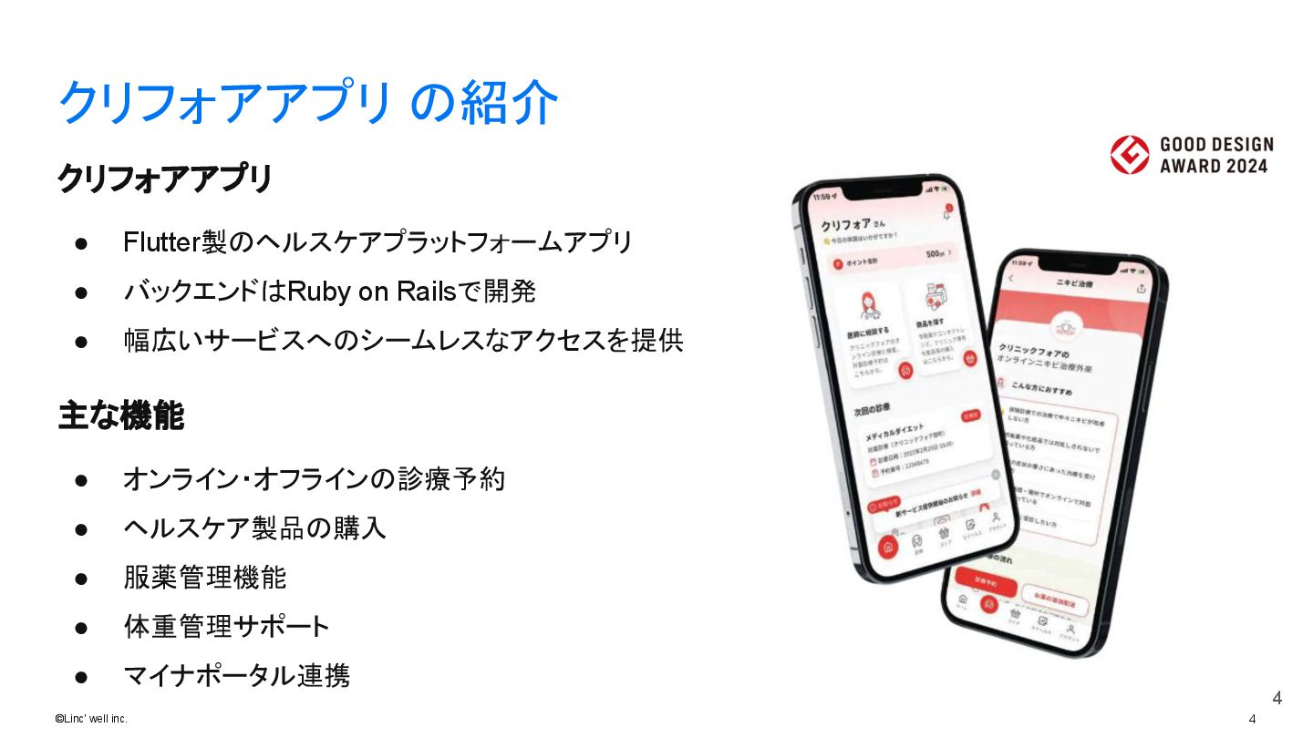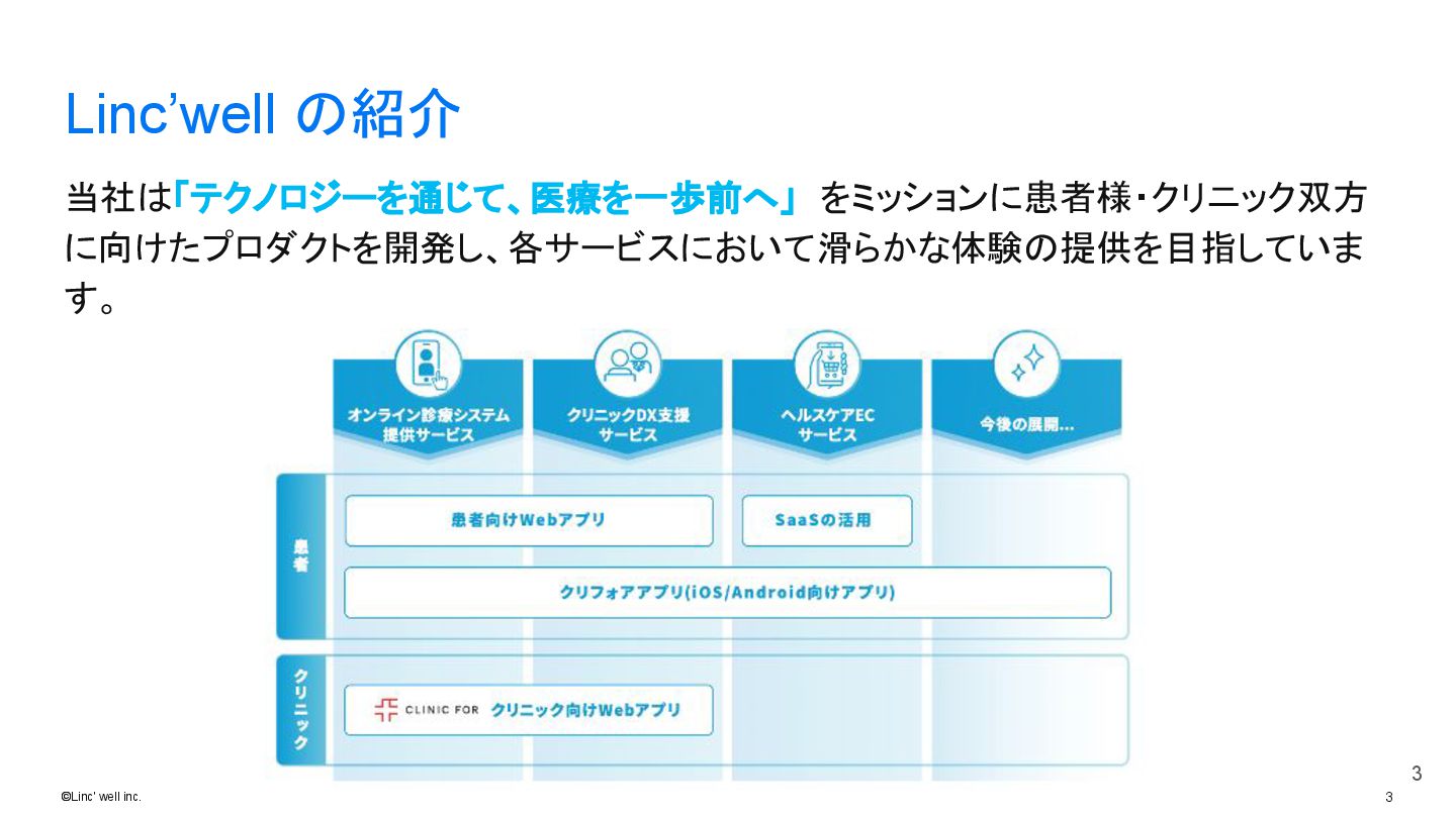 3 ©Linc' well inc. Linc’well の紹介 3 当社は「テクノロジーを通じて、医療を一歩前へ」 をミッションに患者様・クリニック双方 に向けたプロダクトを開発し、各サービスにおいて滑らかな体験の提供を目指していま