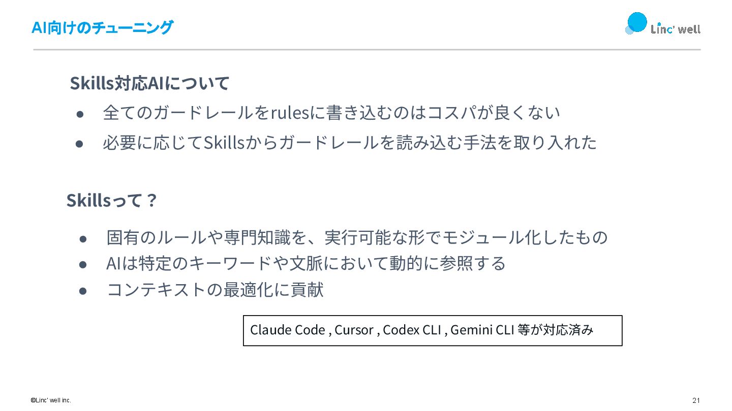 21 ©Linc' well inc. AI向けのチューニング Skills対応AIについて • 全てのガードレールをrulesに書き込むのはコスパが良くない • 必要に応じてSkillsからガードレールを読み込む⼿法を取り⼊れた