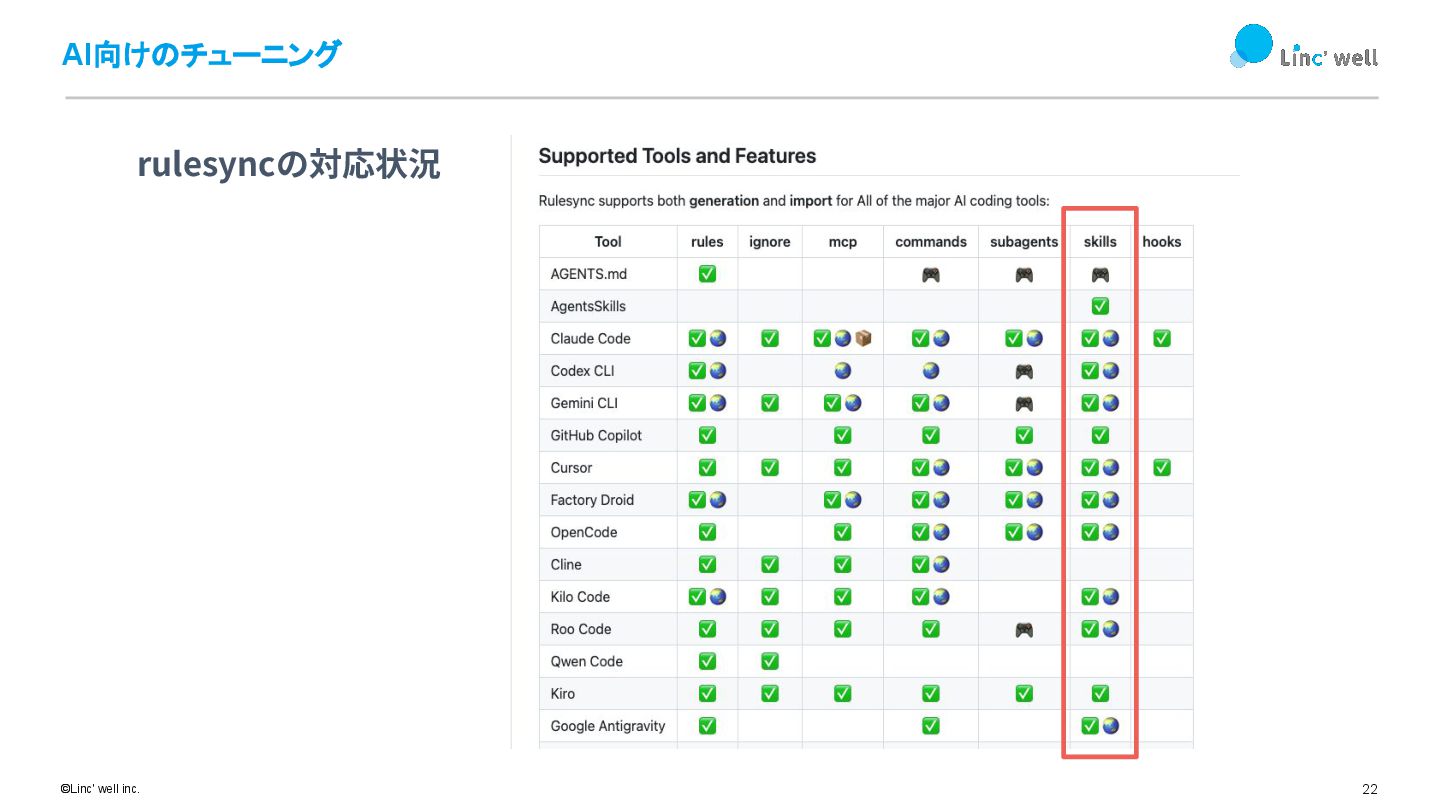 22 ©Linc' well inc. AI向けのチューニング rulesyncの対応状況