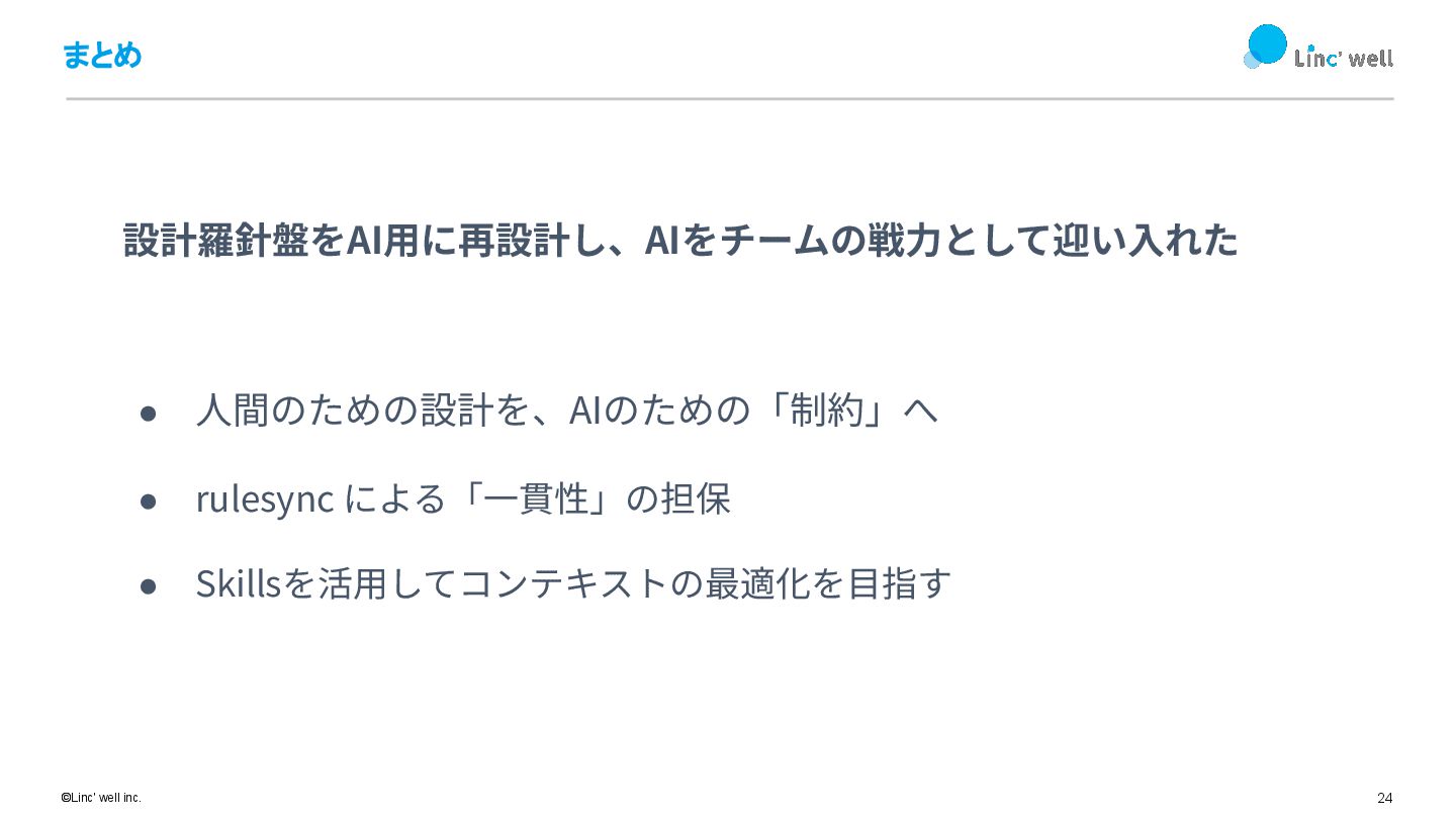 24 ©Linc' well inc. まとめ • ⼈間のための設計を、AIのための「制約」へ • rulesync による「⼀貫性」の担保
