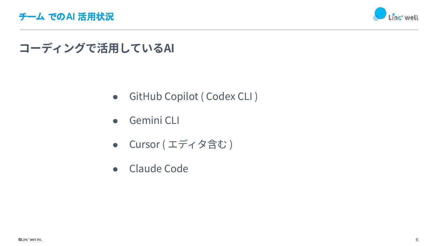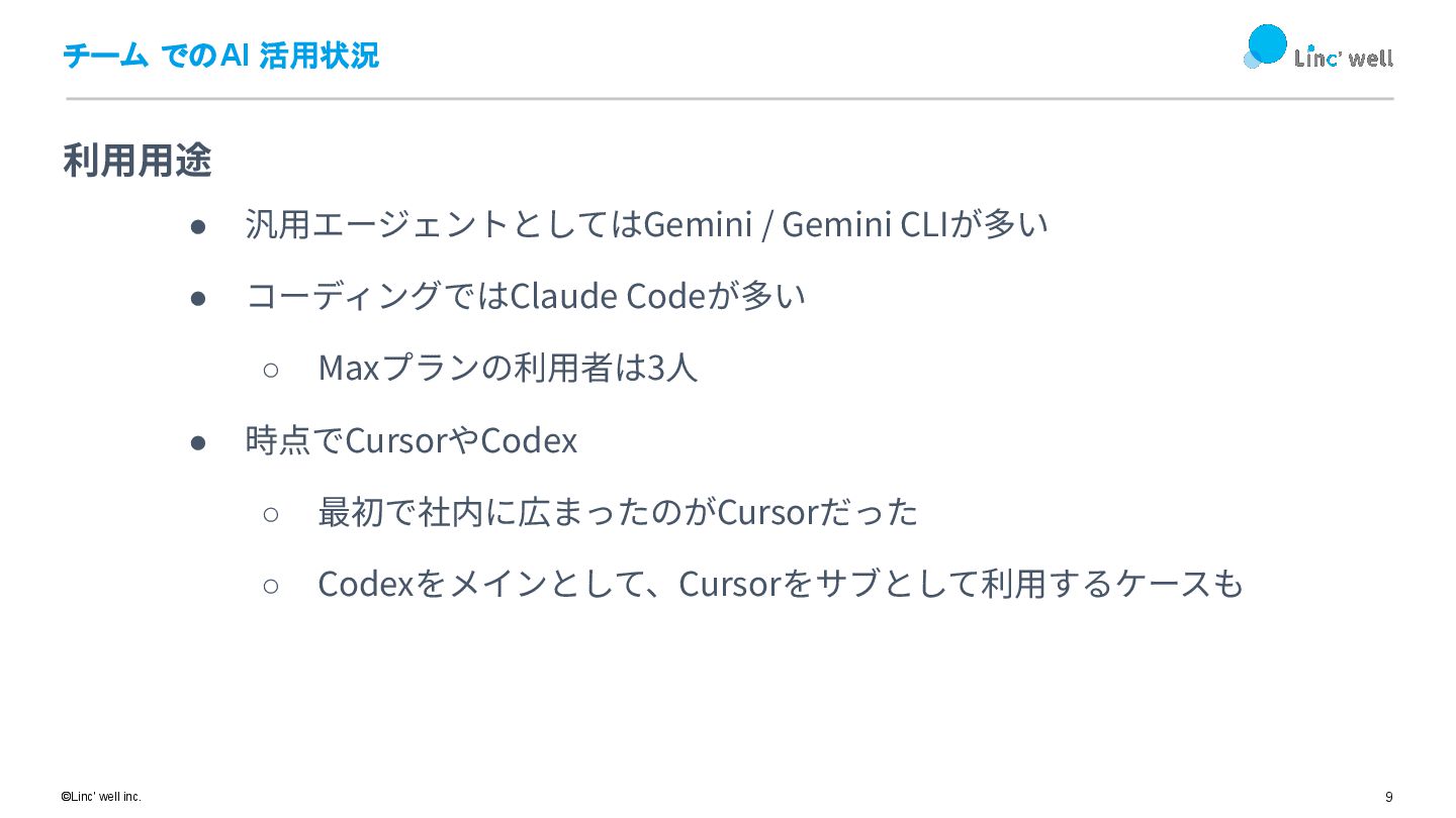 9 ©Linc' well inc. チーム でのAI 活用状況 • 汎⽤エージェントとしてはGemini /
