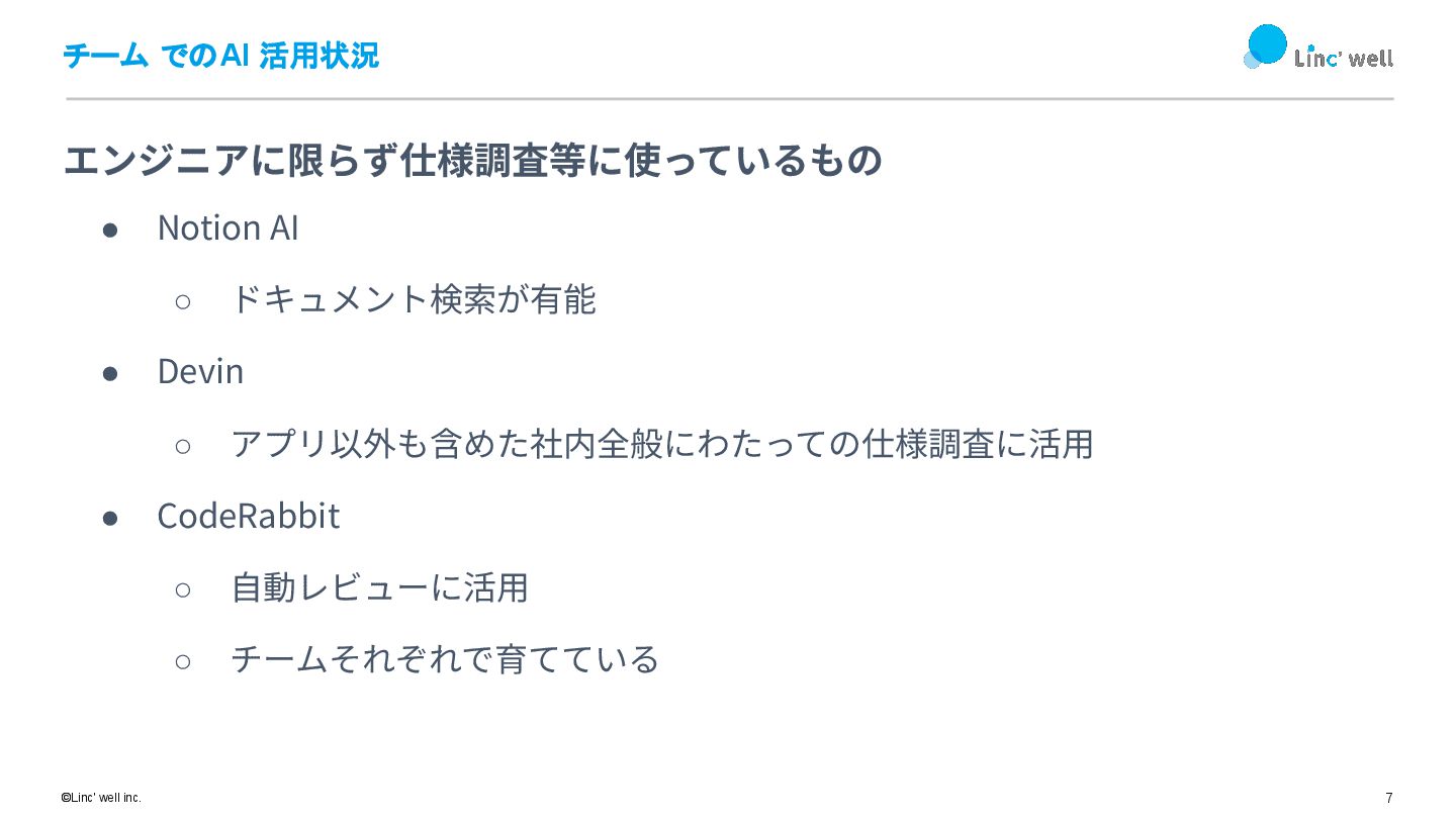 6 ©Linc' well inc. チーム でのAI 活用状況 • GitHub Copilot