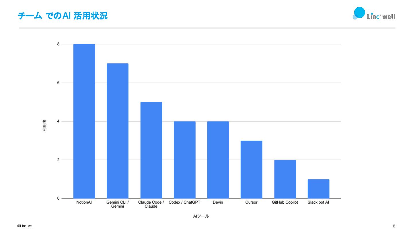 7 ©Linc' well inc. チーム でのAI 活用状況 • Notion AI