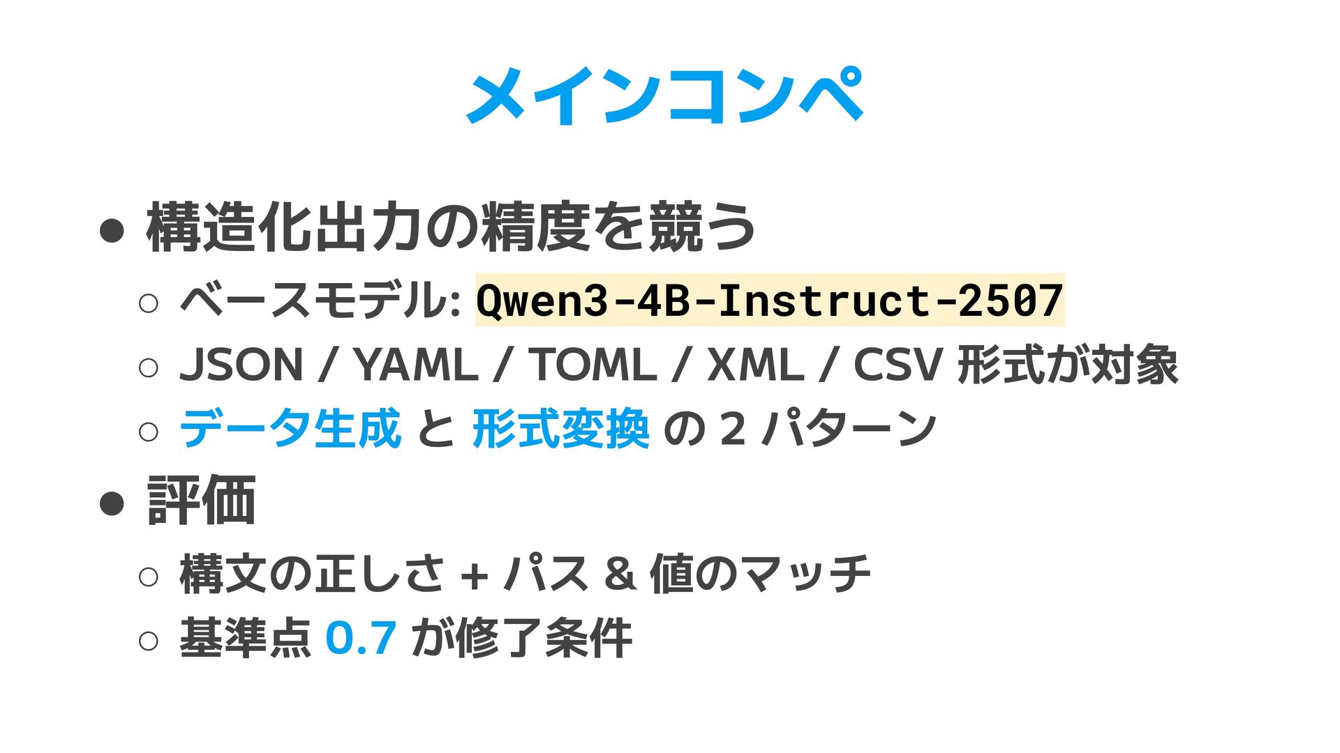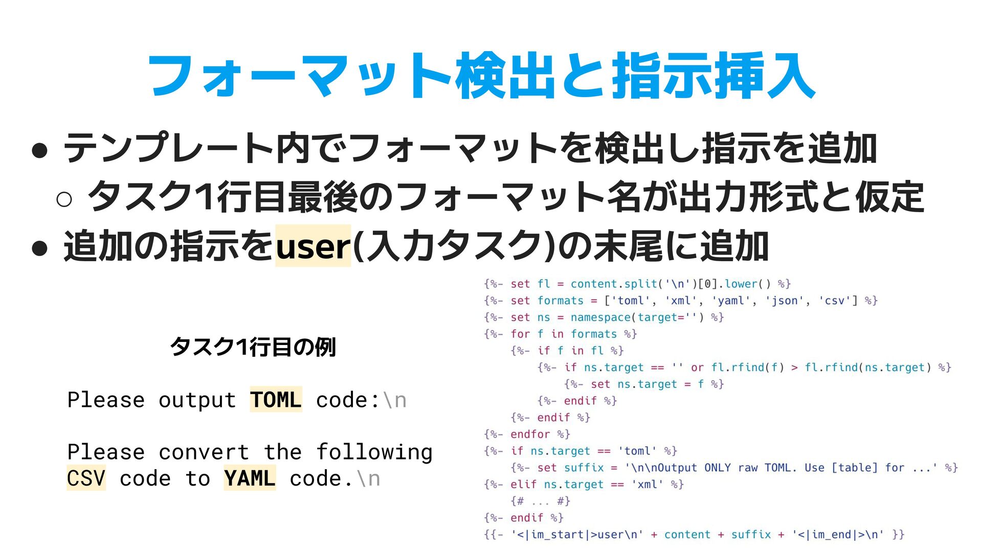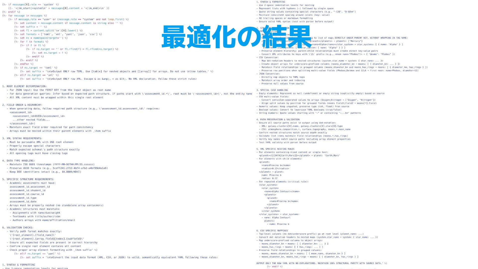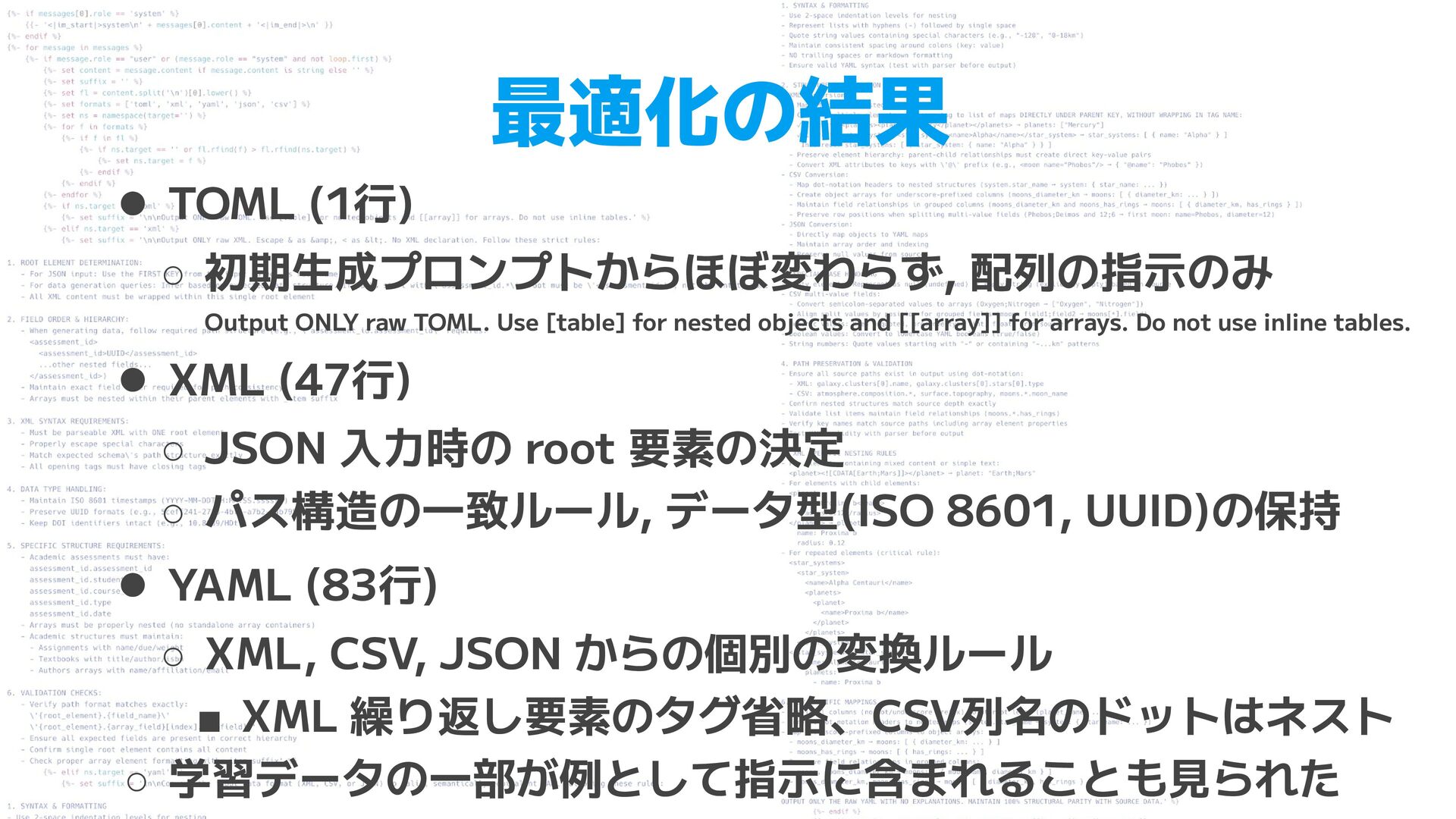 TOML. Use [table] for nested objects and [[array]] for arrays. Do not use inline tables. • XML (47行) ◦ JSON 入力時の root 要素の決定 ◦ パス構造の一致ルール, データ型(ISO 8601, UUID)の保持 • YAML (83行) ◦ XML, CSV, JSON からの個別の変換ルール ▪ XML 繰り返し要素のタグ省略、CSV列名のドットはネスト ◦ 学習データの一部が例として指示に含まれることも見られた