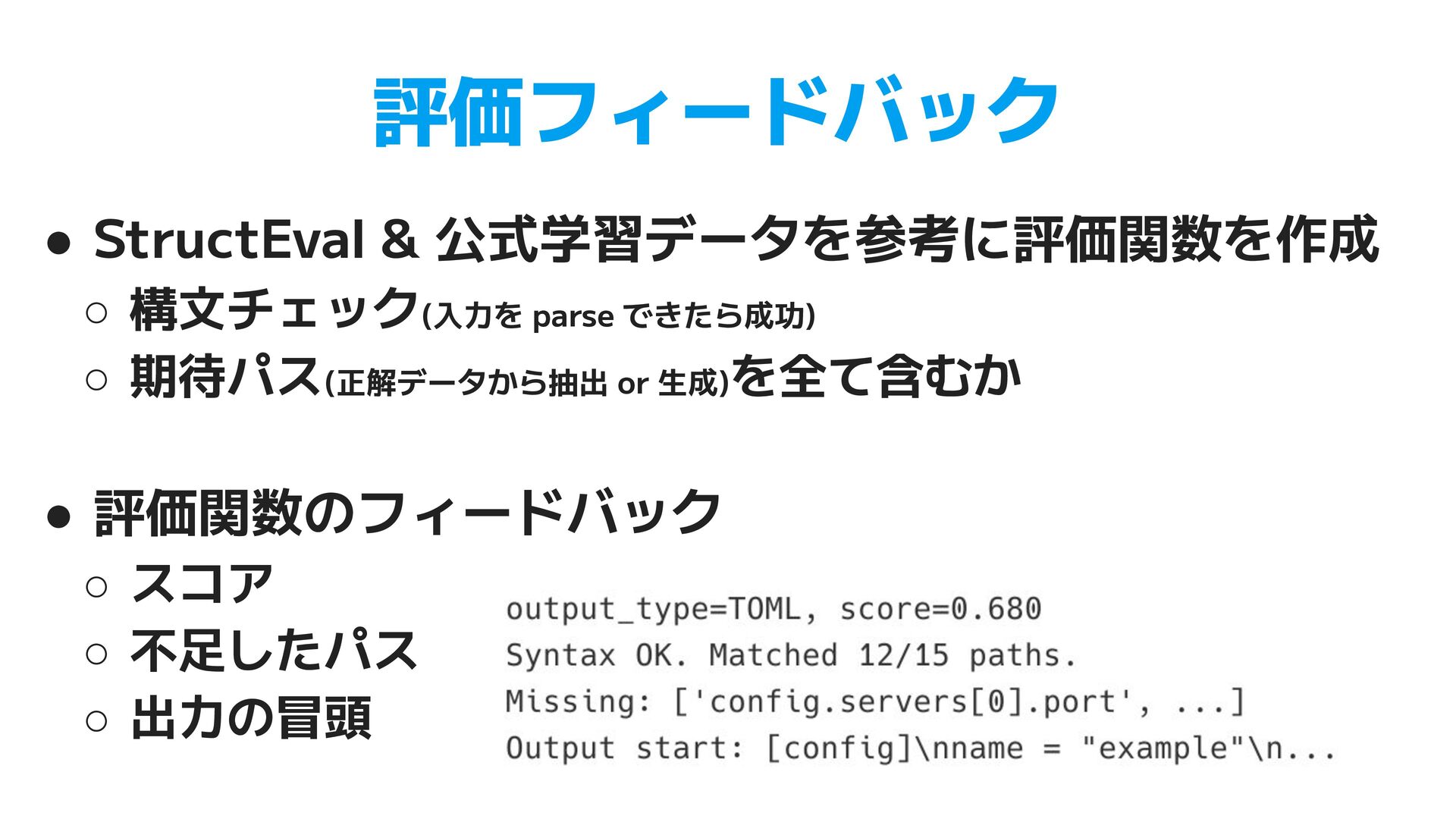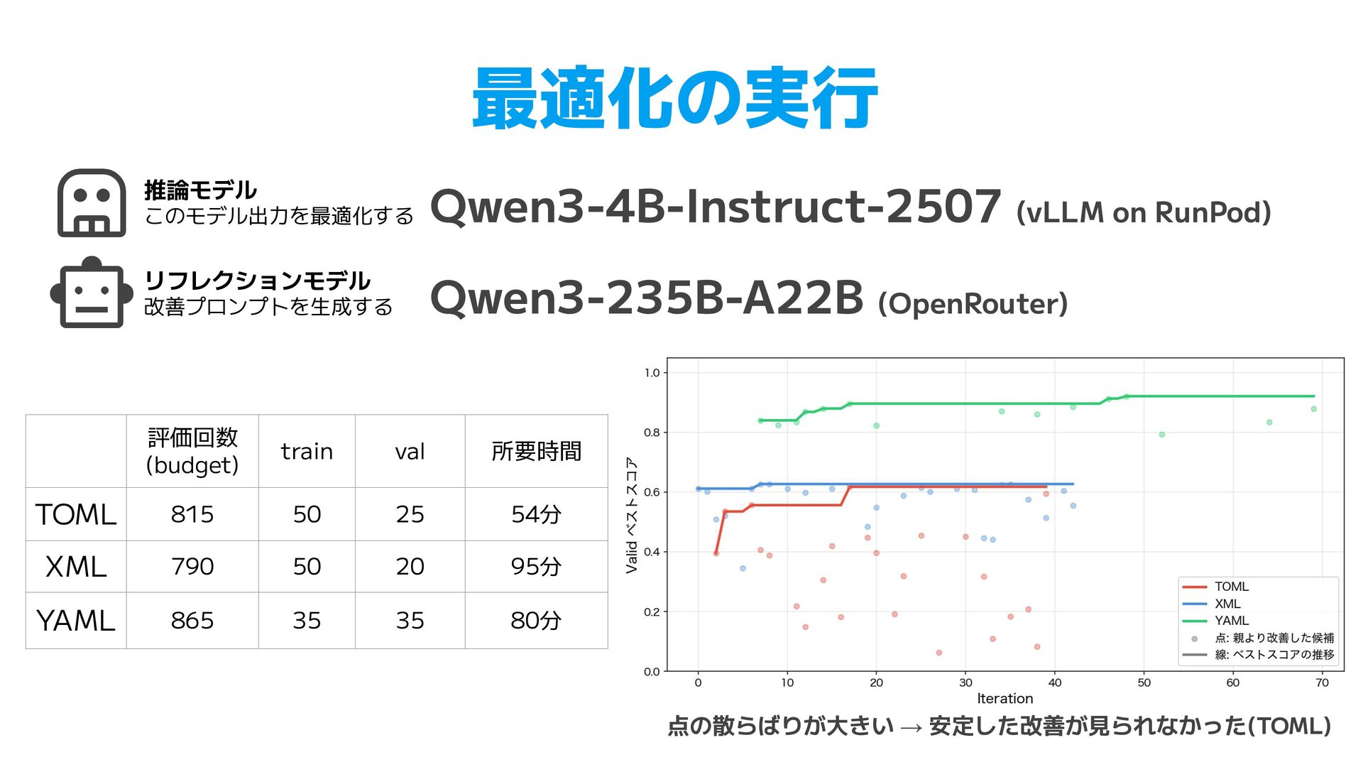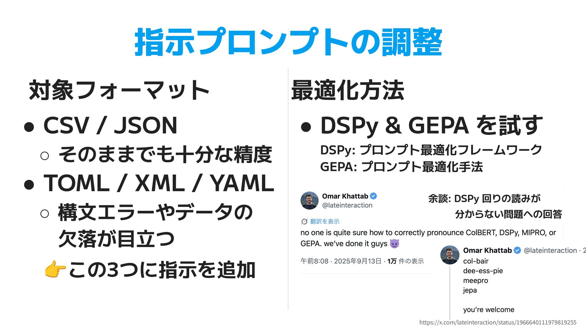 TOML. Use [table] for nested objects and [[array]] for arrays. Do not use inline tables. • XML (47行) ◦ JSON 入力時の root 要素の決定 ◦ パス構造の一致ルール, データ型(ISO 8601, UUID)の保持 • YAML (83行) ◦ XML, CSV, JSON からの個別の変換ルール ▪ XML 繰り返し要素のタグ省略、CSV列名のドットはネスト ◦ 学習データの一部が例として指示に含まれることも見られた