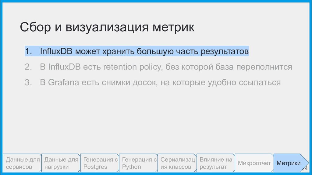 Рассказ об особенностях подготовки тестовых данных для тестов производительности новых микросервисов в банке. Поделюсь наработками по генерации тестовых данных в PostgreSQL и их влиянии на результат тестирования. Обсудим, что включить в отчёт по тестированию производительности и без чего в нем не обойтись. Также расскажу о наработках по сбору метрик в InfluxDB и их визуализации в Grafana.