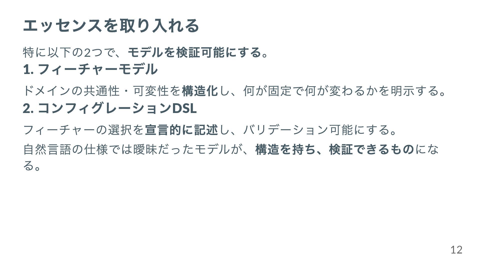 エッセンスを取り入れる 特に以下の2 つで、モデルを検証可能にする。 1. フィーチャーモデル ドメインの共通性・可変性を構造化し、何が固定で何が変わるかを明示する。 2. コンフィグレーションDSL フィーチャーの選択を宣言的に記述し、バリデーション可能にする。 自然言語の仕様では曖昧だったモデルが、構造を持ち、検証できるものにな