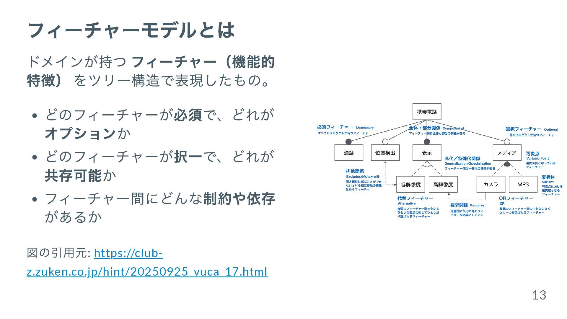フィーチャーモデルとは ドメインが持つ フィーチャー(機能的 特徴) をツリー構造で表現したもの。 どのフィーチャーが必須で、どれが オプションか どのフィーチャーが択一で、どれが 共存可能か フィーチャー間にどんな制約や依存