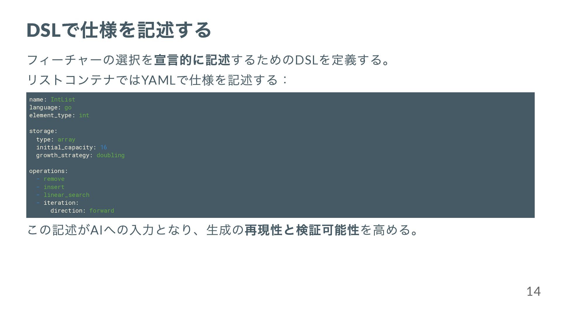 DSL で仕様を記述する フィーチャーの選択を宣言的に記述するためのDSL を定義する。 リストコンテナではYAML で仕様を記述する: name: IntList language: go