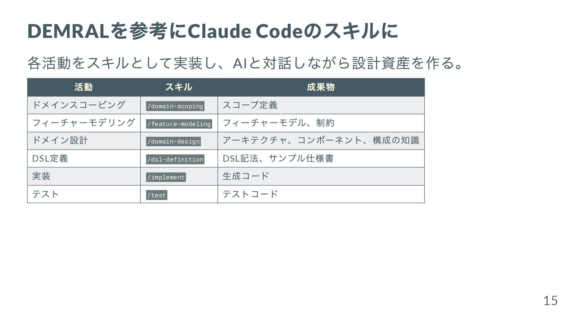 DEMRAL を参考にClaude Code のスキルに 各活動をスキルとして実装し、AI と対話しながら設計資産を作る。 活動 スキル 成果物 ドメインスコーピング