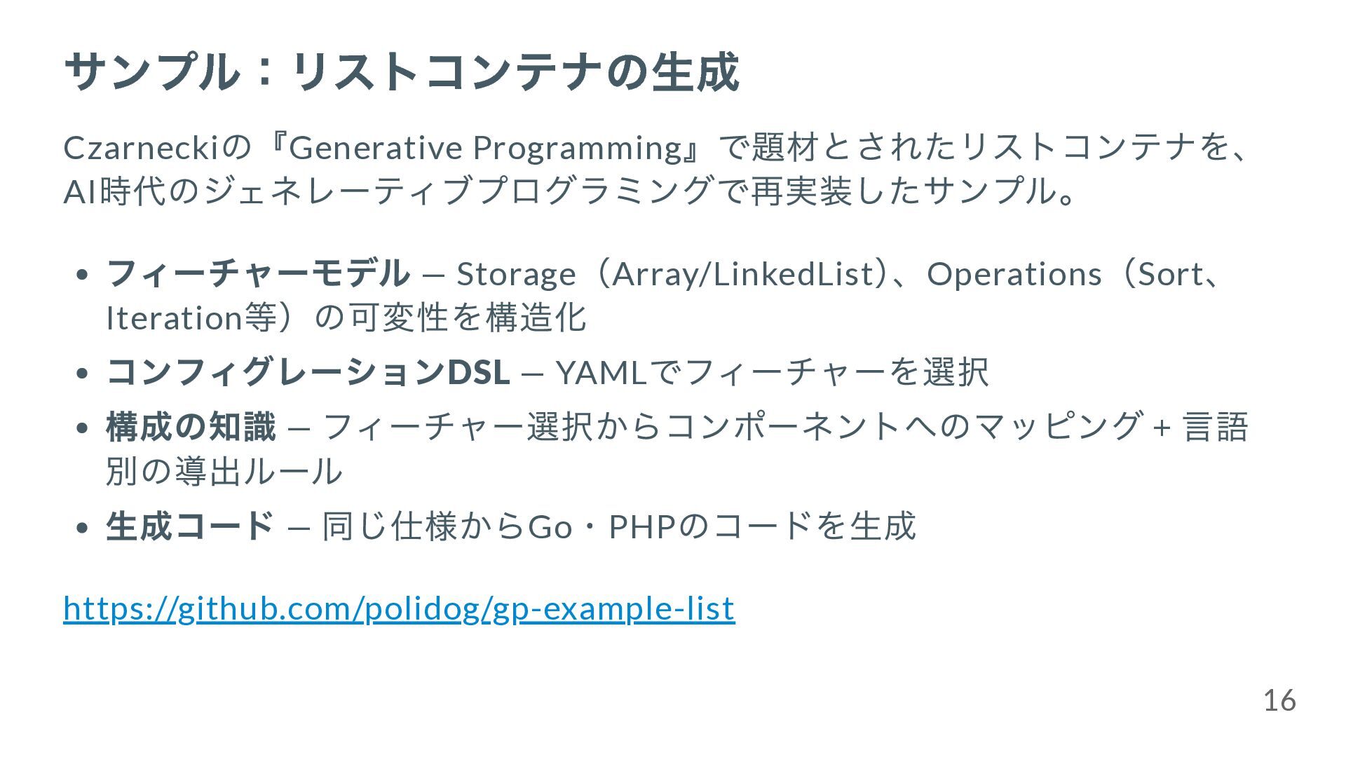 (Array/LinkedList ) 、Operations (Sort 、 Iteration 等)の可変性を構造化 コンフィグレーションDSL — YAML でフィーチャーを選択 構成の知識 — フィーチャー選択からコンポーネントへのマッピング + 言語 別の導出ルール 生成コード — 同じ仕様からGo ・PHP のコードを生成 https://github.com/polidog/gp-example-list 16