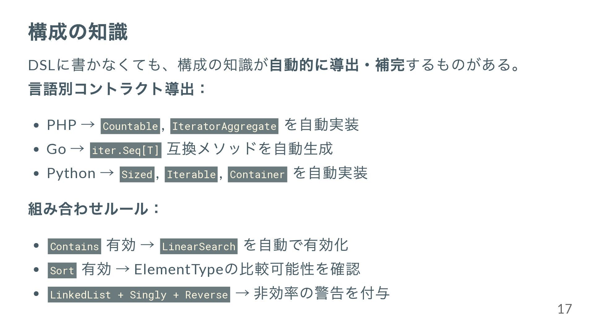 構成の知識 DSL に書かなくても、構成の知識が自動的に導出・補完するものがある。 言語別コントラクト導出: PHP → Countable , IteratorAggregate を自動実装