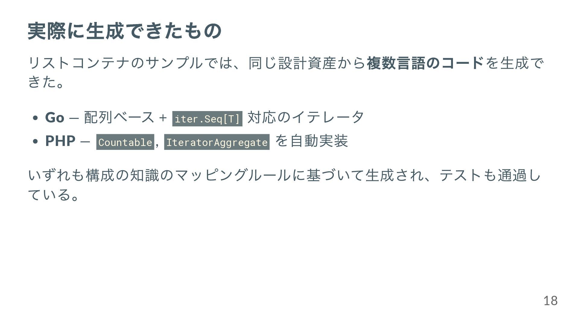 — Countable , IteratorAggregate を自動実装 いずれも構成の知識のマッピングルールに基づいて生成され、テストも通過し ている。 18