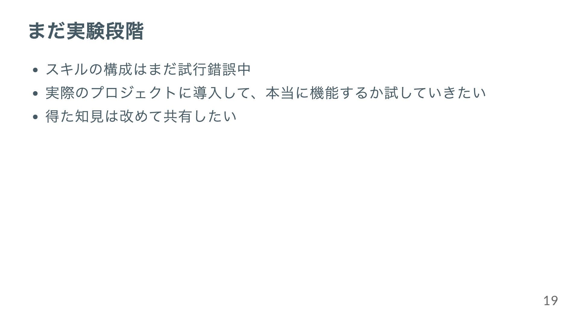 まだ実験段階 スキルの構成はまだ試行錯誤中 実際のプロジェクトに導入して、本当に機能するか試していきたい 得た知見は改めて共有したい 19