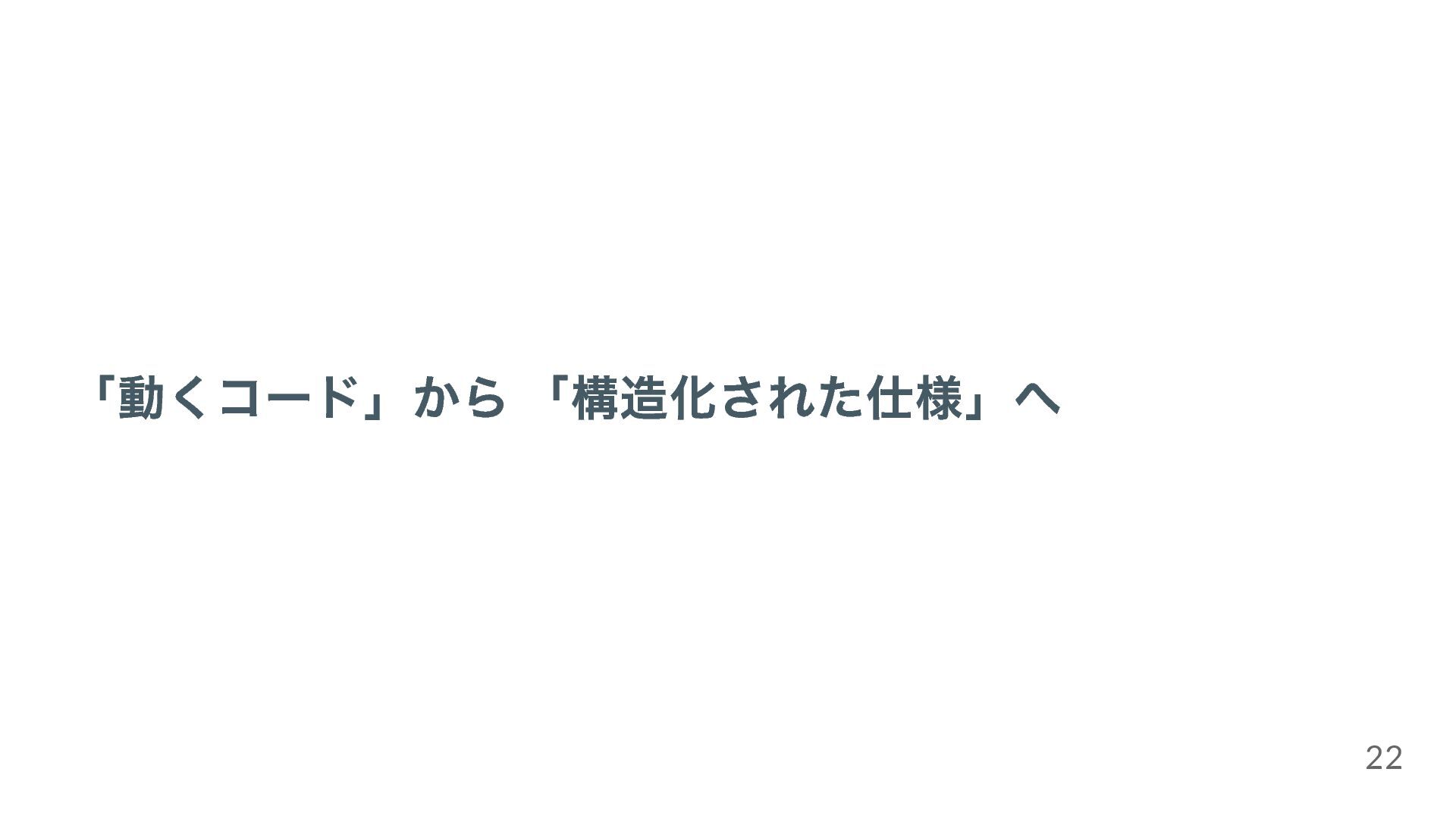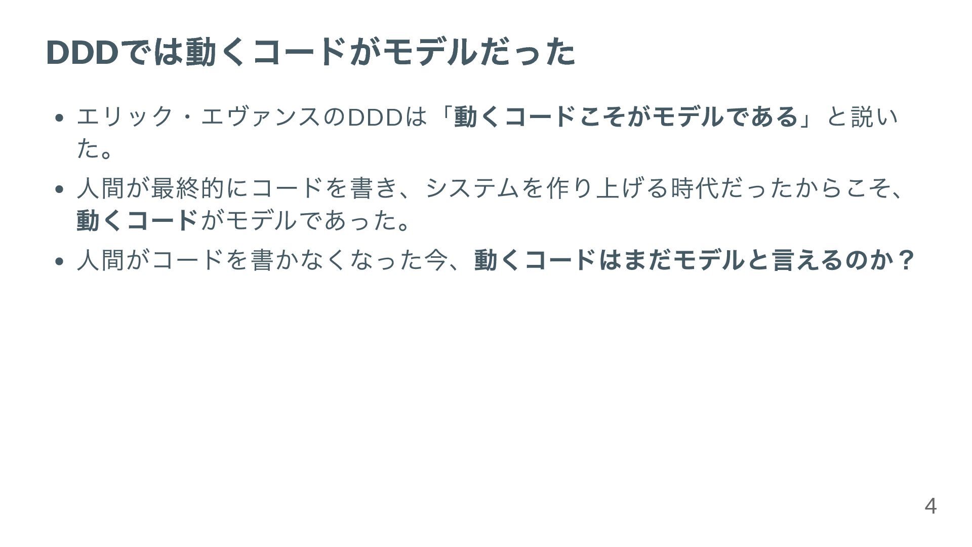 DDD では動くコードがモデルだった エリック・エヴァンスのDDD は「動くコードこそがモデルである」と説い た。 人間が最終的にコードを書き、システムを作り上げる時代だったからこそ、 動くコードがモデルであった。 人間がコードを書かなくなった今、動くコードはまだモデルと言えるのか? 4